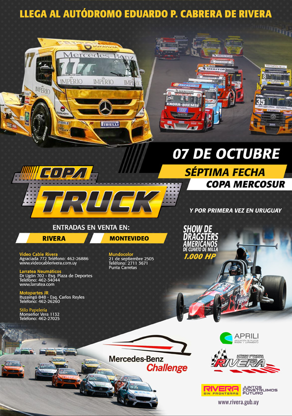 Por segunda vez consecutiva, após o sucesso do ano passado, a Copa Truck volta a Rivera, para mais uma etapa decisiva da temporada 2019 no Autódromo Eduardo P. Cabrera, nos días 31 de agosto e 1º de setembro.