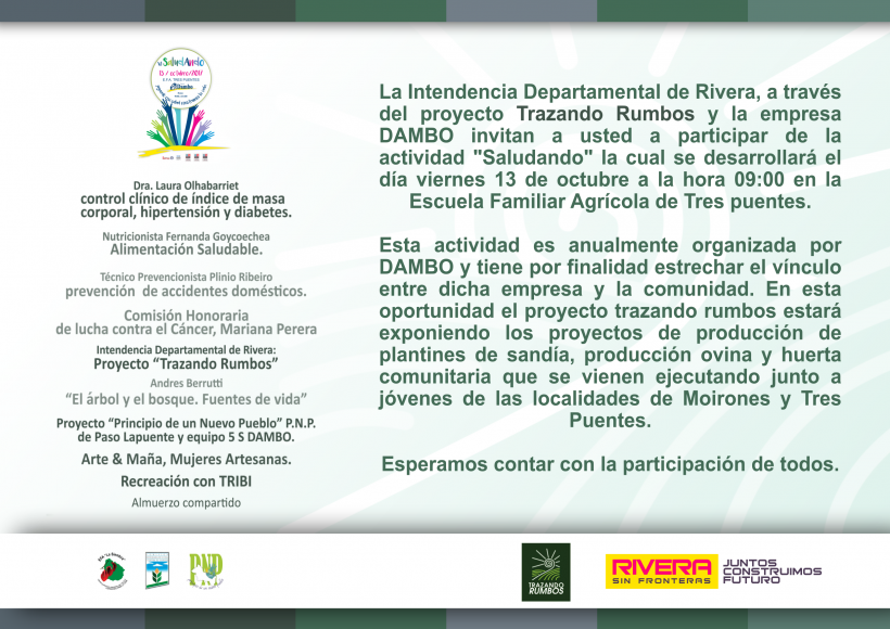 La Intendencia Departamental de Rivera, a través del proyecto Trazando Rumbos y la empresa DAMBO, invitan a participar de la actividad «Saludando». Dicha actividad se llevará a cabo el día viernes 13 de octubre, a las 9 horas, en la Escuela Familiar Agrícola de Tres Puentes.