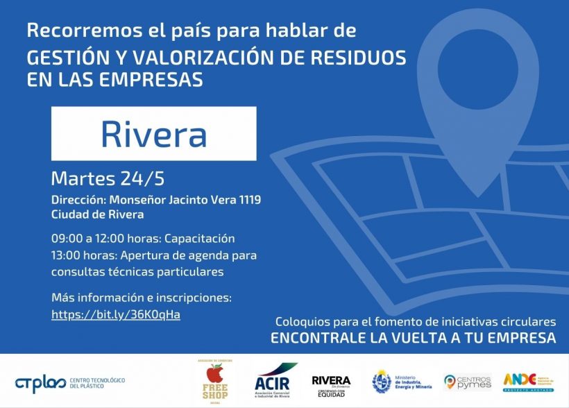 Este martes 25 de mayo, se realizará en Rivera el Coloquio para el fomento de iniciativas circulares: Encontrale la vuelta a tu empresa. El evento tendrá lugar en Monseñor Vera 1119, de 9:00 a 12 horas. A las 13:00 se realizará la apertura para consultas técnicas particulares. Más información e inscripciones: https://bit.ly/3ayjERD