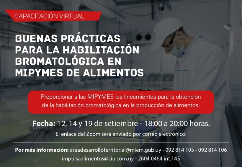 Los días 12, 14 y 19 de setiembre, de 18 a 20 horas, el MIEM realizará capacitaciones vía zoom, con el fin de proporcionar lineamientos a las MIPYMES para la obtención de habilitación bromatológica en la producción de alimentos.