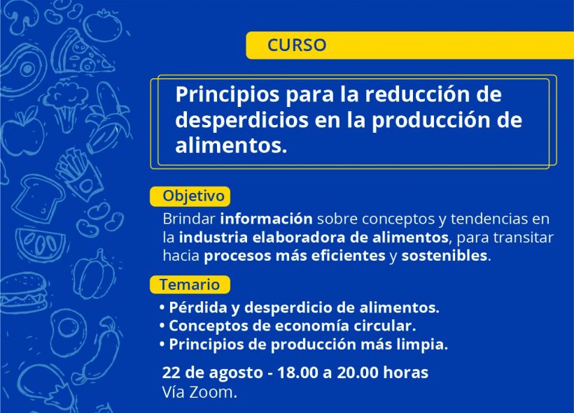 Este 22 de agosto, de 18:00 a 20:00 horas, se dictará el curso “Principios para la reducción de desperdicios en la producción de alimentos”, para mipymes de alimentos, organizado por Dinapyme MIEM y dictado por el LATU.