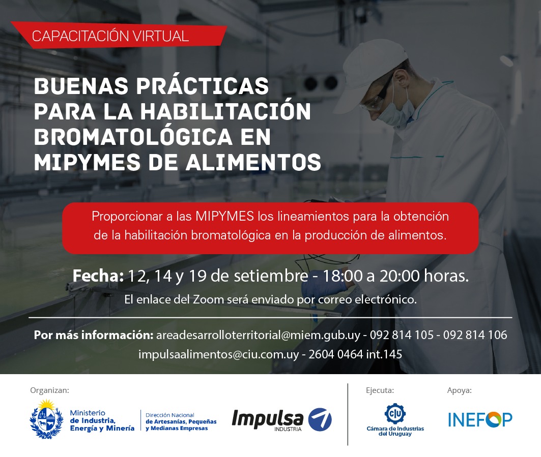 Los días 12, 14 y 19 de setiembre, de 18 a 20 horas, el MIEM realizará capacitaciones vía zoom, con el fin de proporcionar lineamientos a las MIPYMES para la obtención de habilitación bromatológica en la producción de alimentos.