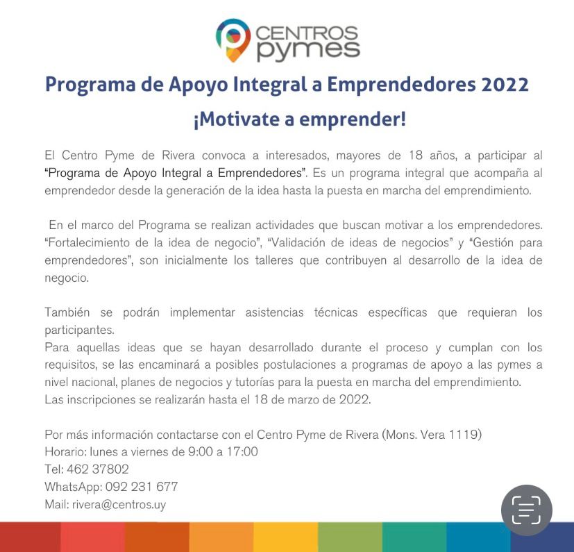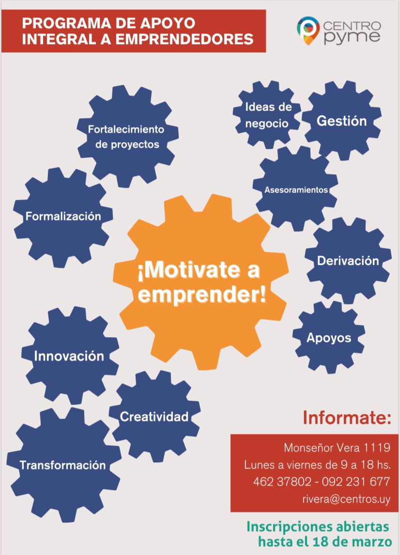 El Centro Pyme de Rivera convoca a interesados, mayores de 18 años, a participar del «Programa de Apoyo Integral a Emprendedores», que acompaña al emprendedor desde la generación de la idea hasta la puesta en marcha del emprendimiento.