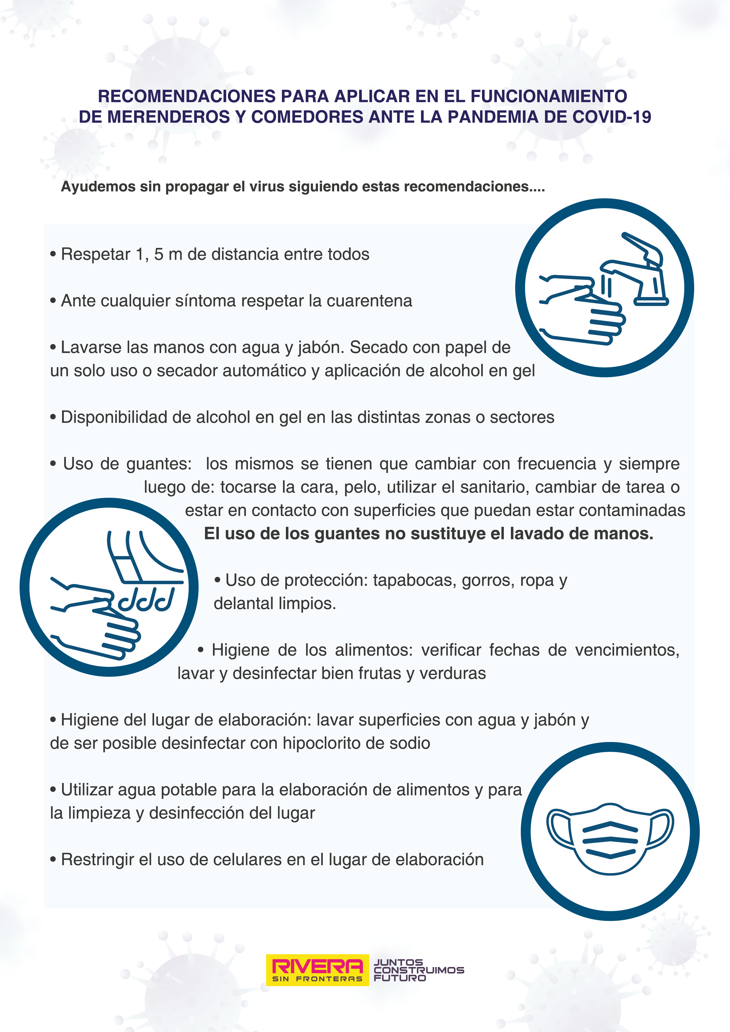 - Realizar una adecuada higiene de las manos previo a manipular los alimentos (bastante jabón y refregar por 20 segundos mínimo), es determinante en la reducción de riesgos. El uso de guantes no sustituye el lavado de manos.