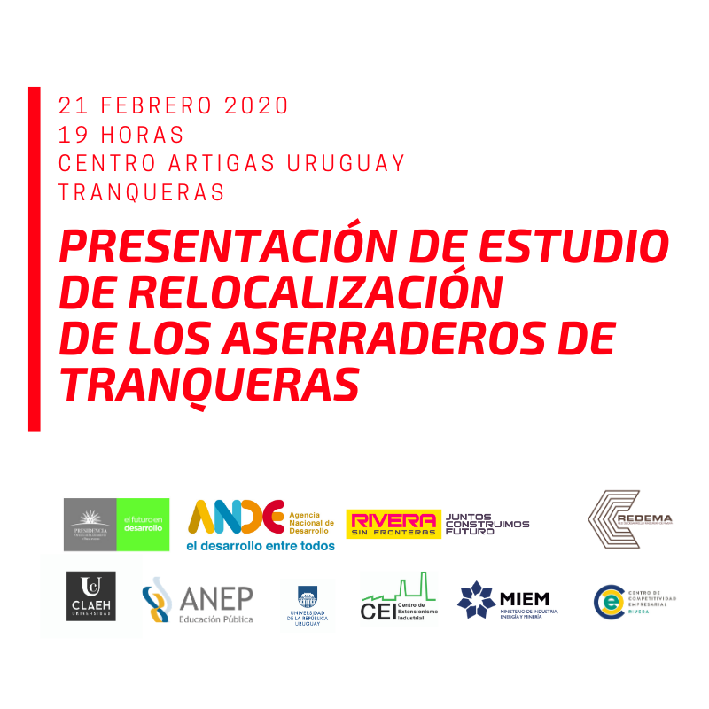 El próximo viernes 21 de febrero de 2020 se llevará acabo la Presentación del Estudio de viabilidad de la relocalización de los aserraderos de Tranqueras. Dicho estudio fue realizado por la consultora AIC, en el marco del proyecto REDEMA. Se convoca a empresarios de aserraderos, autoridades y representantes de instituciones públicas y privadas de la […]