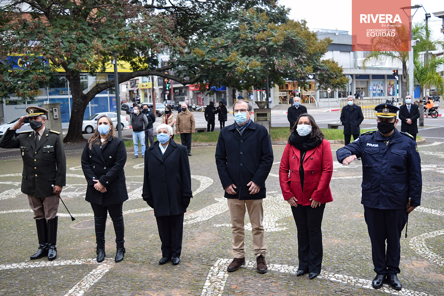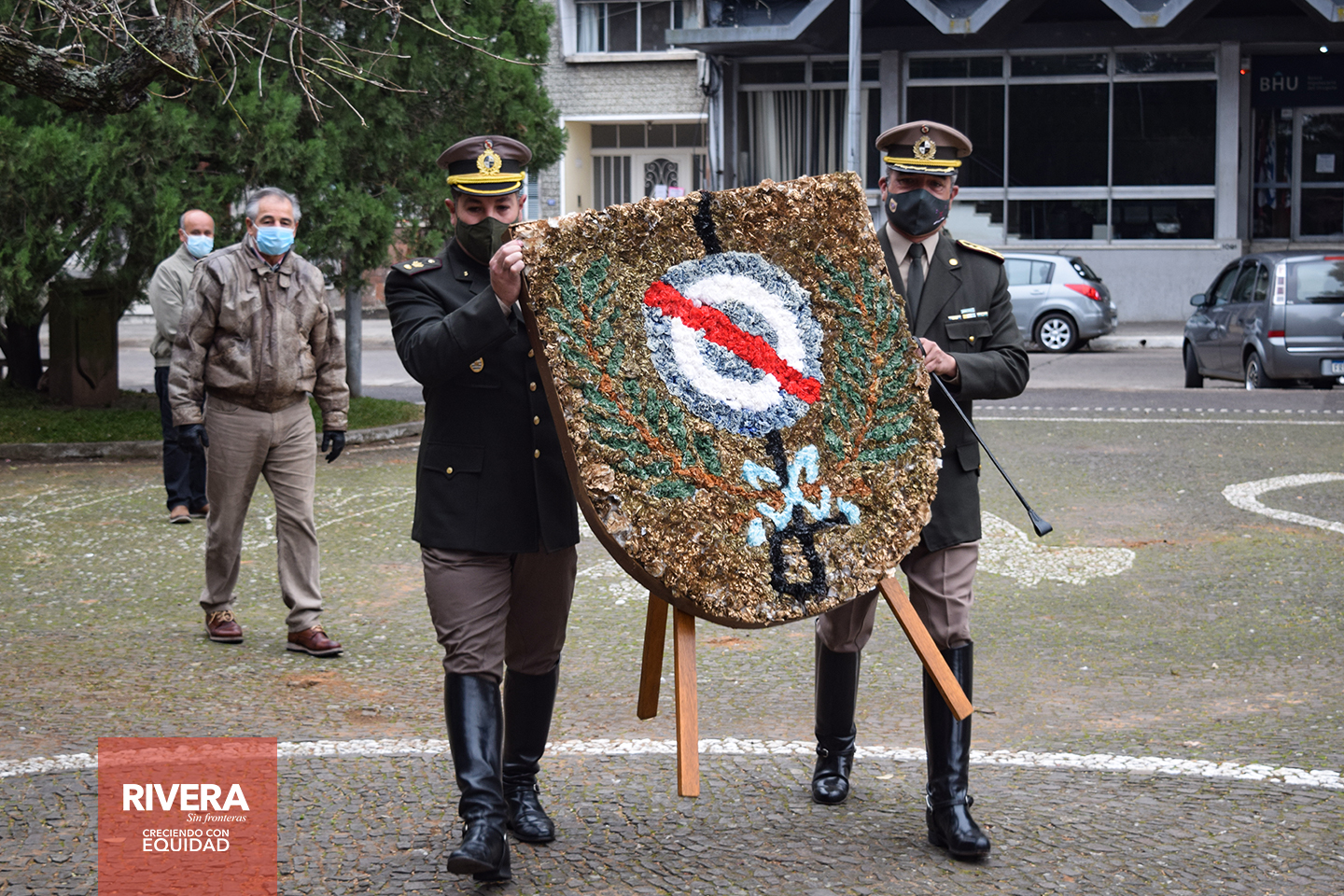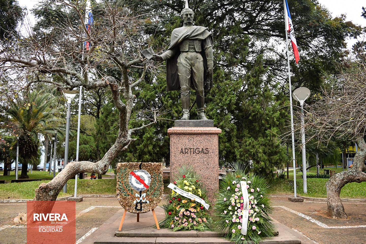 En el marco de los 257 años del natalicio de José Gervasio Artigas, el intendente Cr. Richard Sander Darín, junto a autoridades departamentales, y de la Asociación Patriótica de Rivera, rinden homenaje al prócer en el Rincón de la Patria de Plaza Artigas.