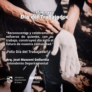 1°de mayo: Día del Trabajador 1 mayo, 2025 Reconocemos y celebramos el esfuerzo de quienes, con su trabajo, construyen día a día el futuro de nuestra comunidad. ¡Feliz Día del Trabajador! Arq. José Mazzoni Gollardía, Intendente Departamental Share on TwitterTweet Share on LinkedIn Share Send email Mail Print Print