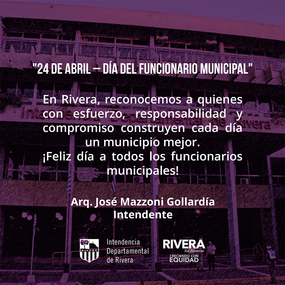 “24 de abril – Día del Funcionario Municipal” 23 abril, 2025 En Rivera, reconocemos a quienes con esfuerzo, responsabilidad y compromiso construyen cada día un municipio mejor. ¡Feliz día a todos los funcionarios municipales! Arq. José Mazzoni Gollardia Intendente Departamental Share on TwitterTweet Share on LinkedIn Share Send email Mail Print Print