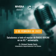 63.° Aniversario de Radio Rivera 6 febrero, 2023 El intendente departamental, Cr. Richard Sander les hace llegar un cordial saludo a directivos y funcionarios de Radio Rivera, por sus 63 años al servicio de todos los habitantes de la frontera. Share on TwitterTweet Share on LinkedIn Share Send email Mail Print Print