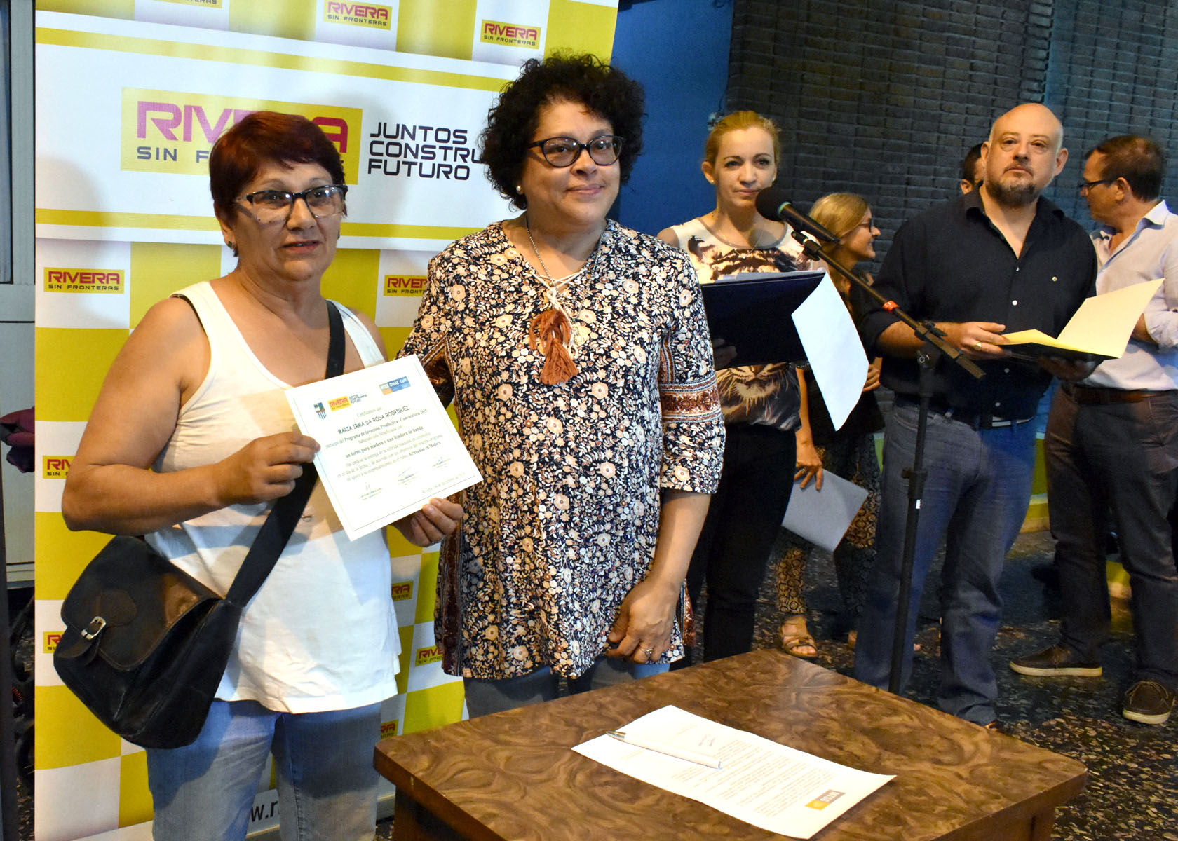 La entrega de maquinarias y herramientas; seguida de la firma del acta; se realizó en la ceremonia protocolar, ante autoridades civiles, departamentales y nacionales; entre ellas el director General de Desarrollo y Medio Ambiente, Q.F. Alejandro Bertón, el director General de Promoción y Acción Social, Cr. Giovani Conti, el referente Territorial del CePE, Carlos Fontes y la referente Regional de Emprendimientos Productivos-Dinae-MTSS, Inés Garri.