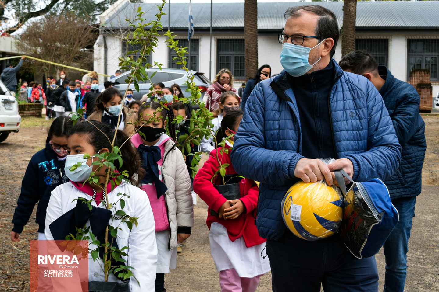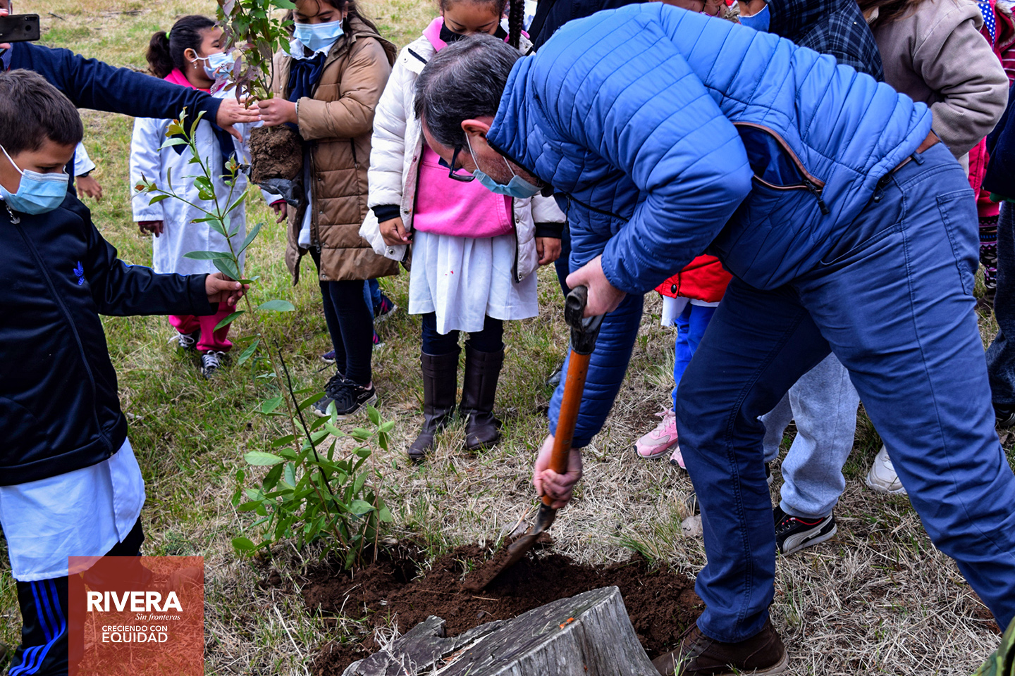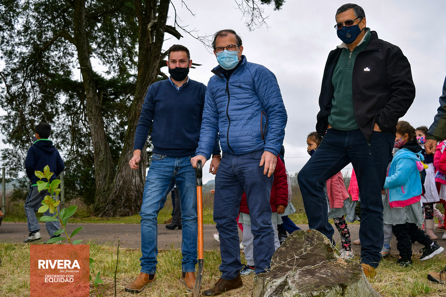 En el marco de las actividades programadas por el Día Mundial del Medio Ambiente (5 de junio), en horas de la mañana de hoy, el intendente departamental, Cr. Richard Sander Darín, visitó la Escuela de Tiempo Completo (ETC) N°37, de Puntas del Cuñapiru, dónde junto a los alumnos y maestros, plantó mudas de árboles nativos, cómo Arazá, Jazmín Uruguayo y Guaviyú.