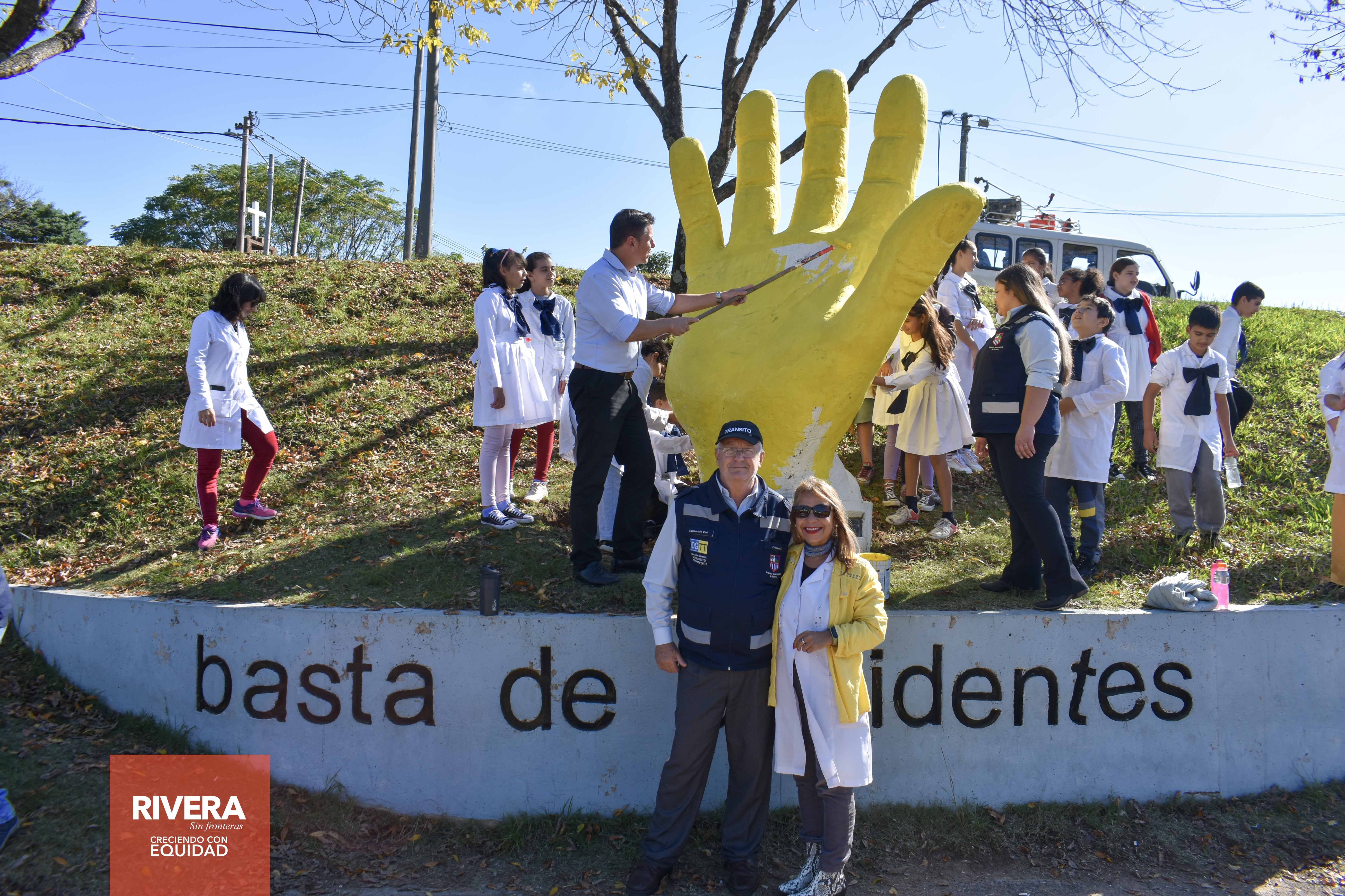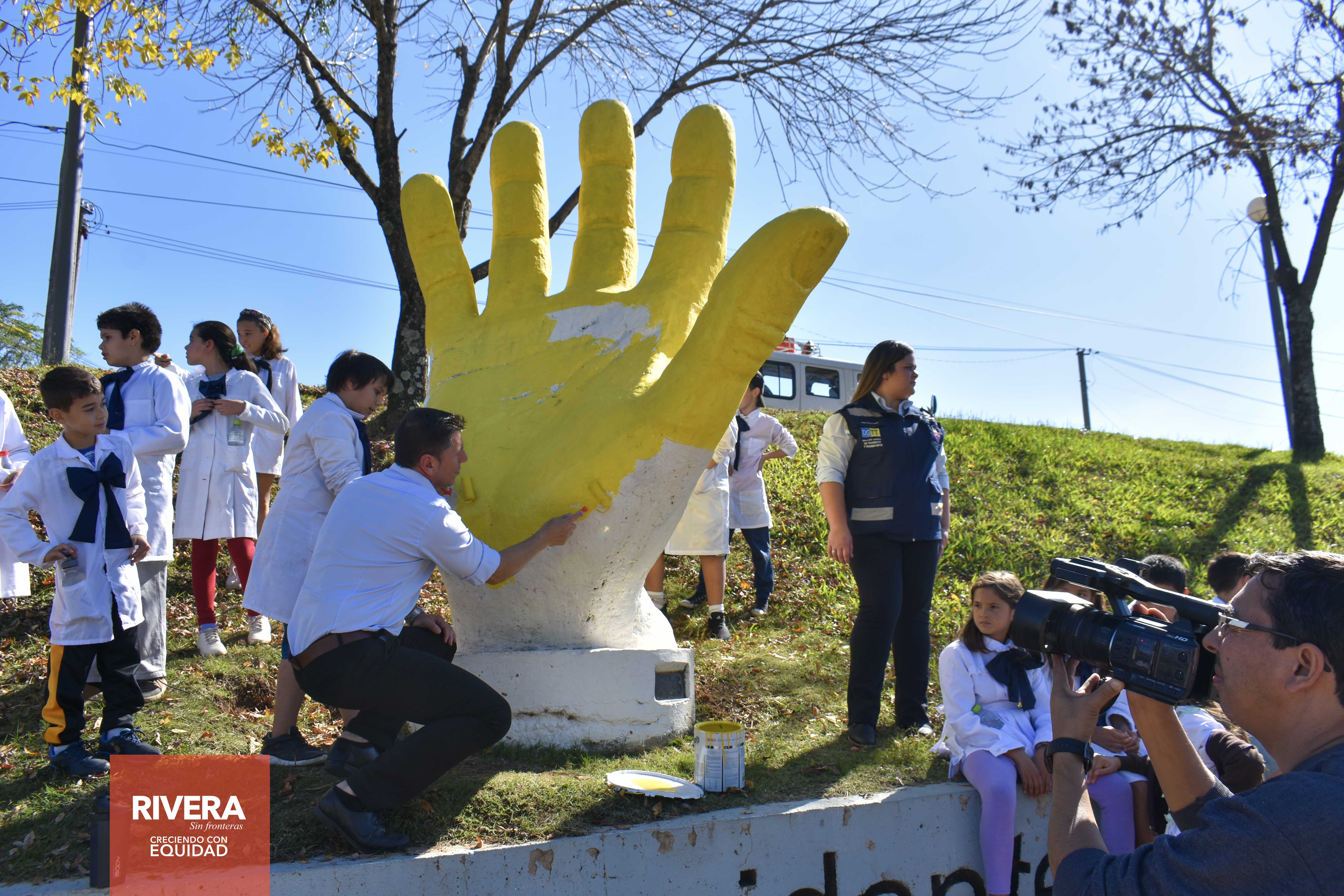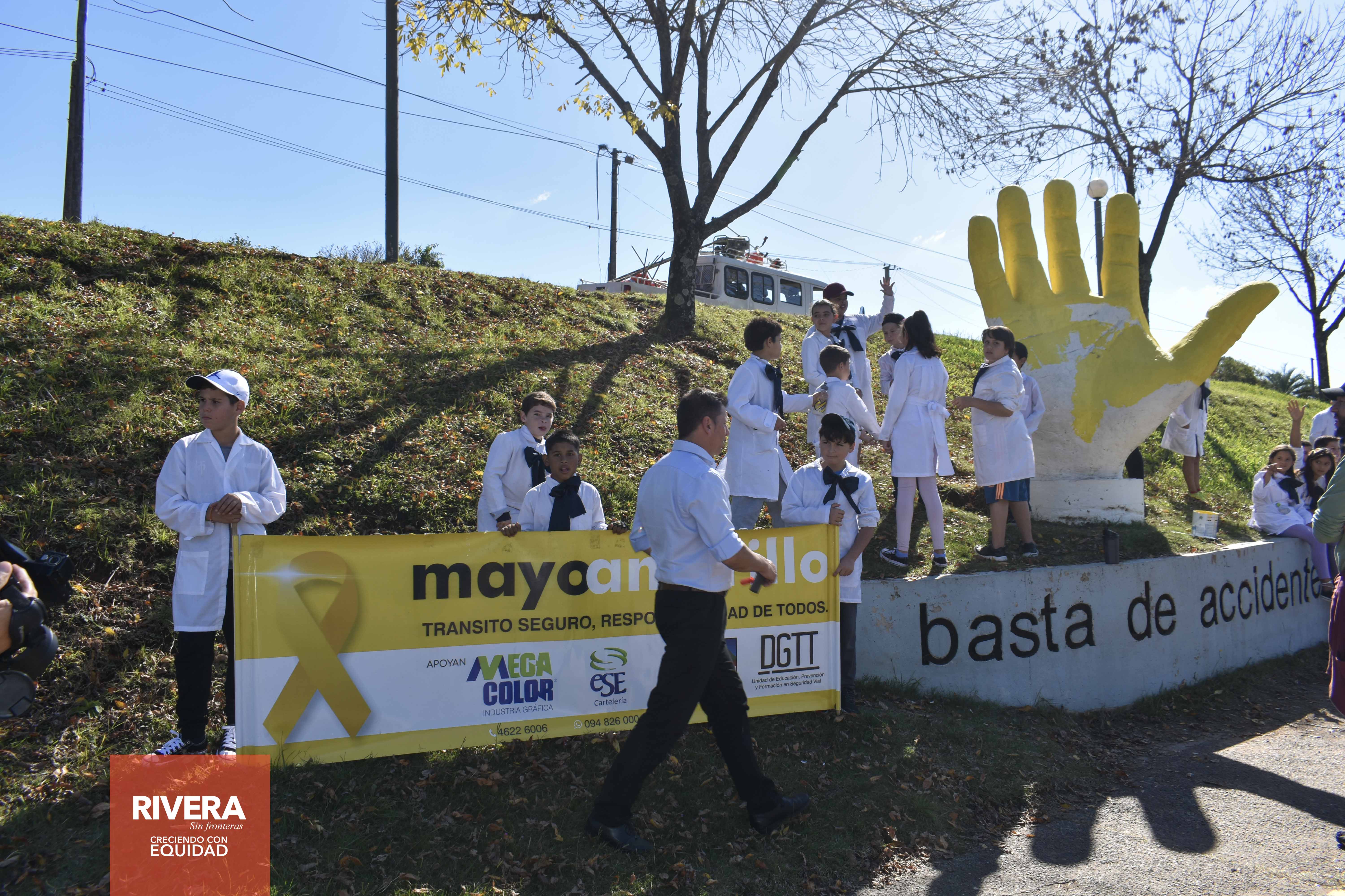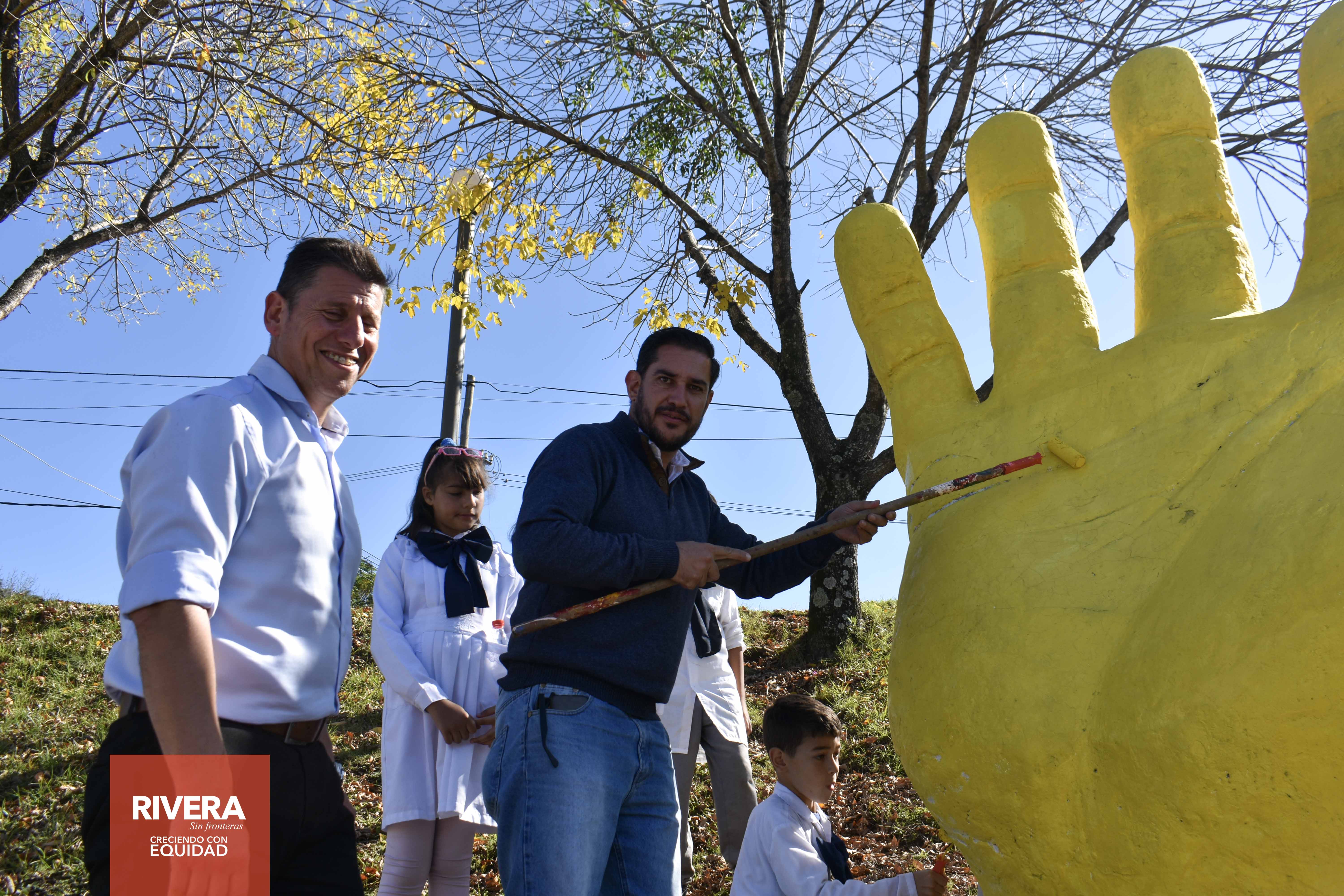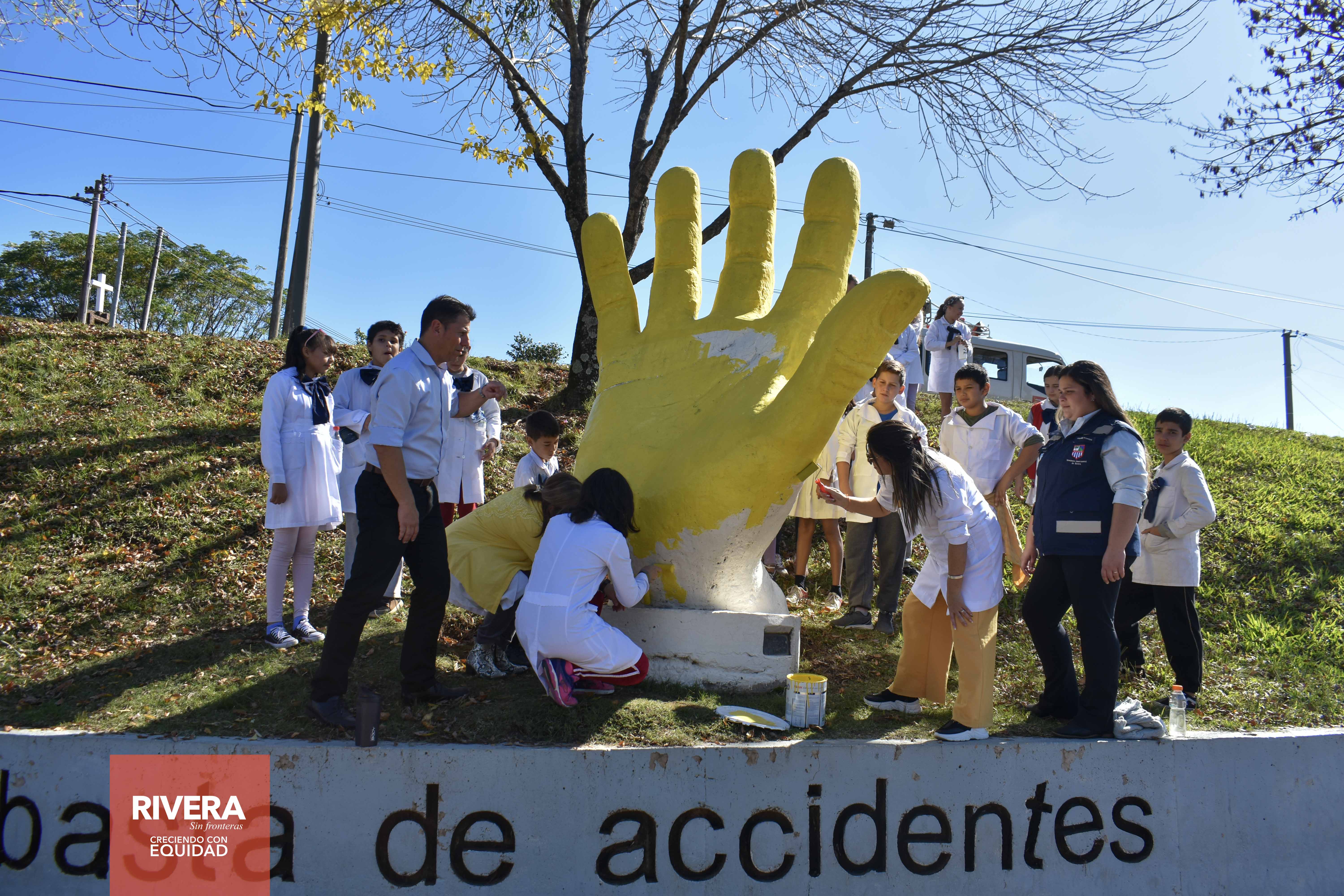 En horas de la mañana del martes 9 de mayo, alumnos y docentes de la escuela Nº 112 de barrio Bisio, autoridades de Educación primaria de la Dirección General de Tránsito y de instituciones asociadas, pintaron un lazo en la entrada del supermercado Macro Mercado y las letras corporeas que forman la palabra RIVERA en color amarillo.