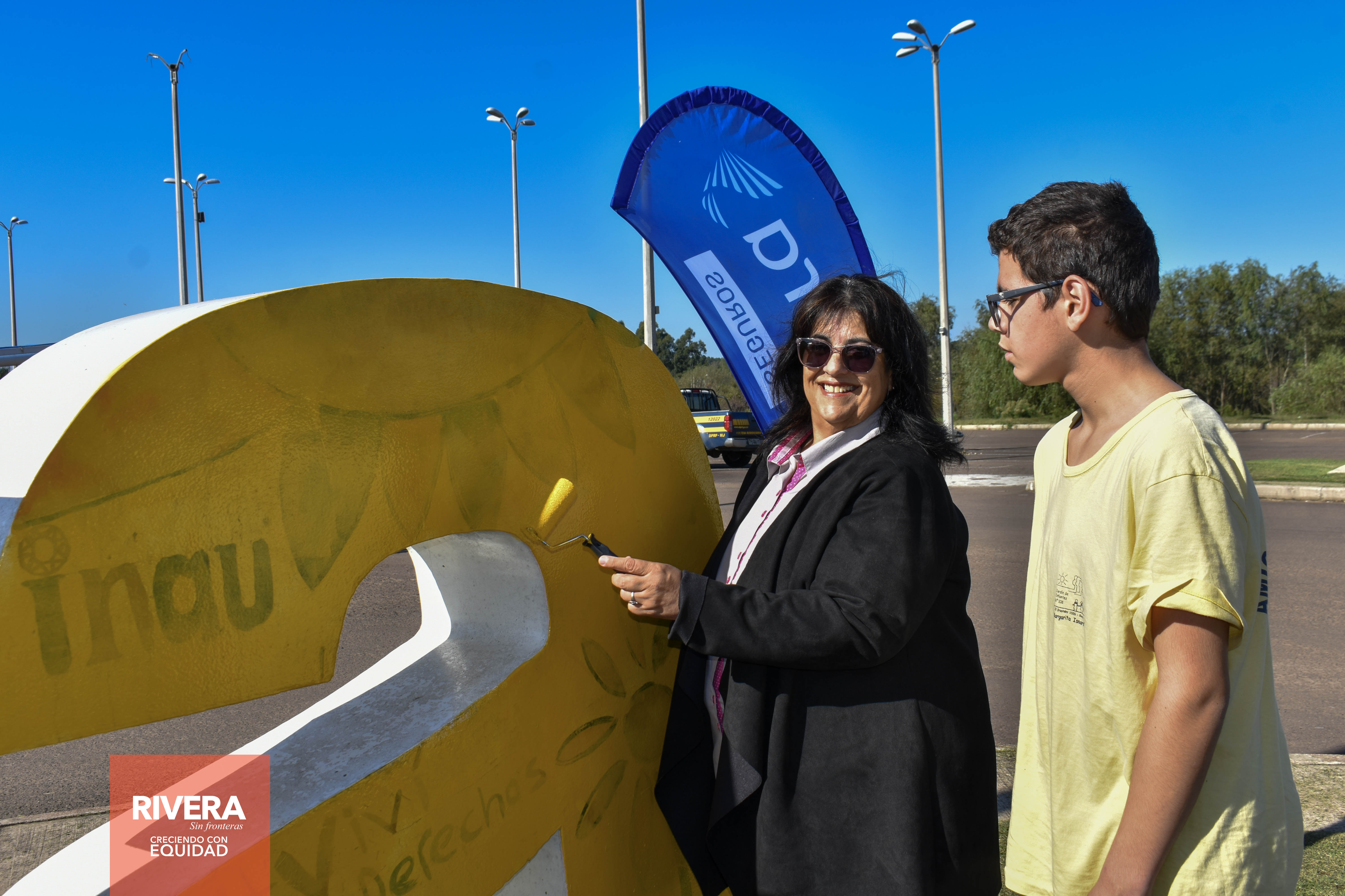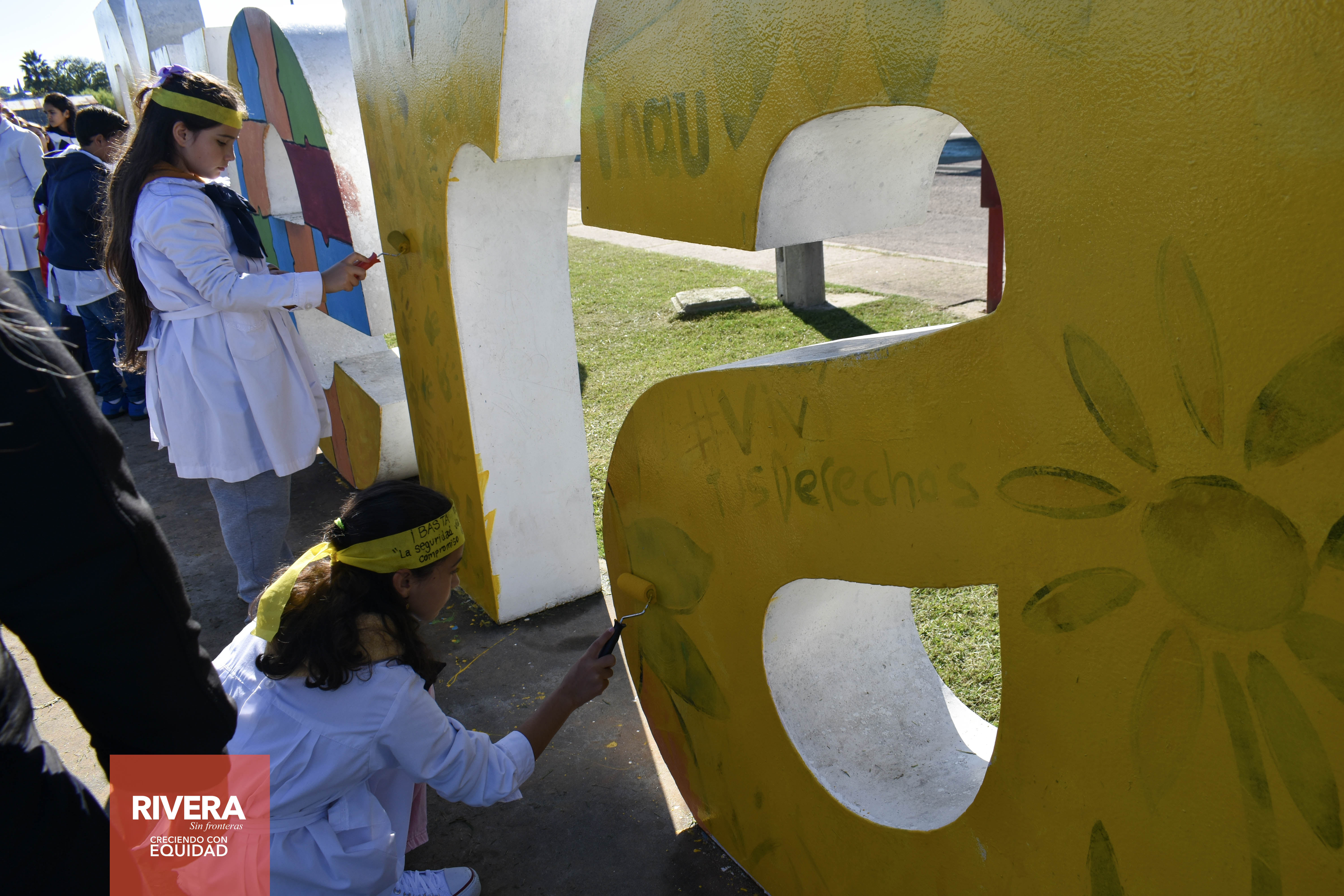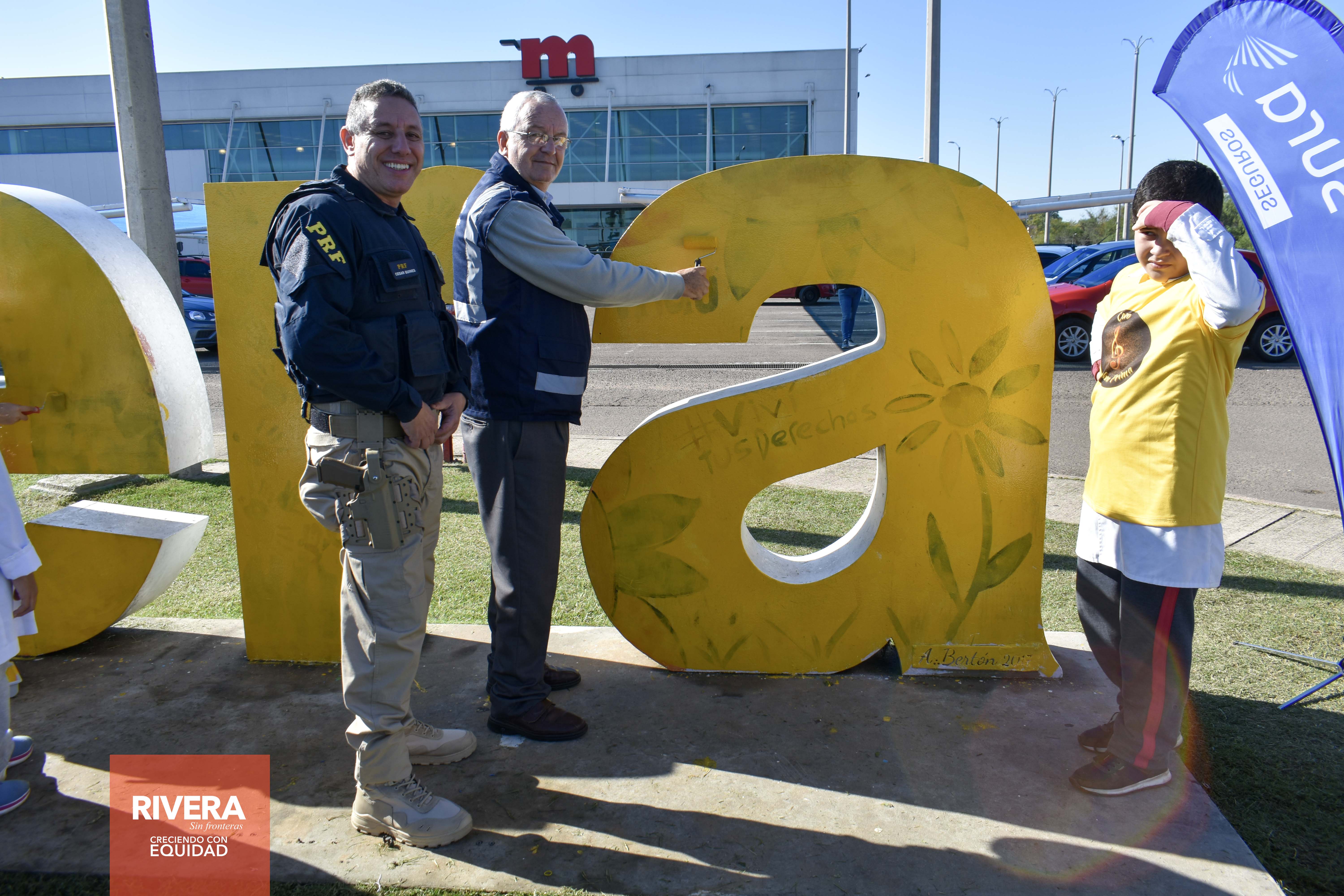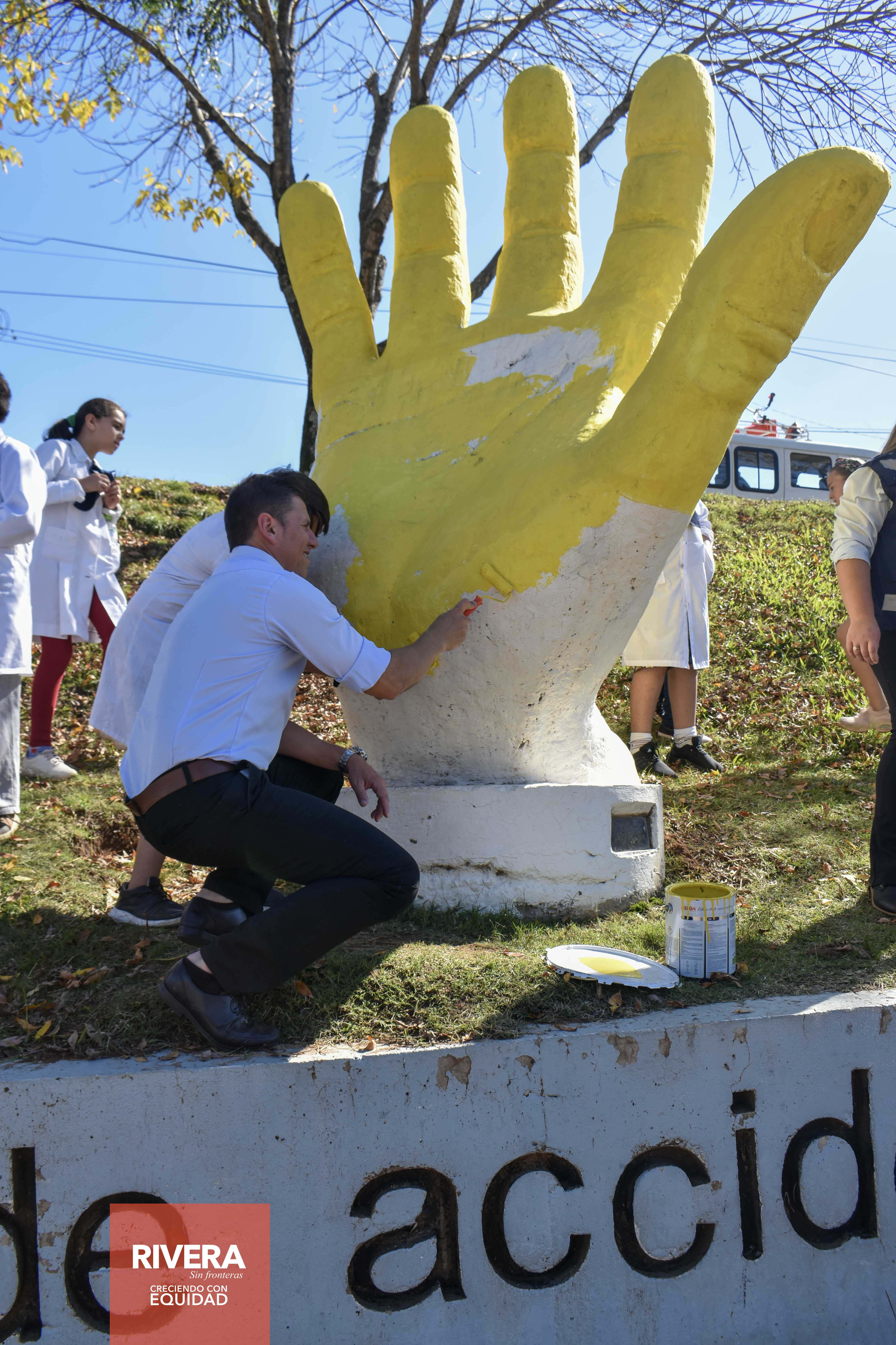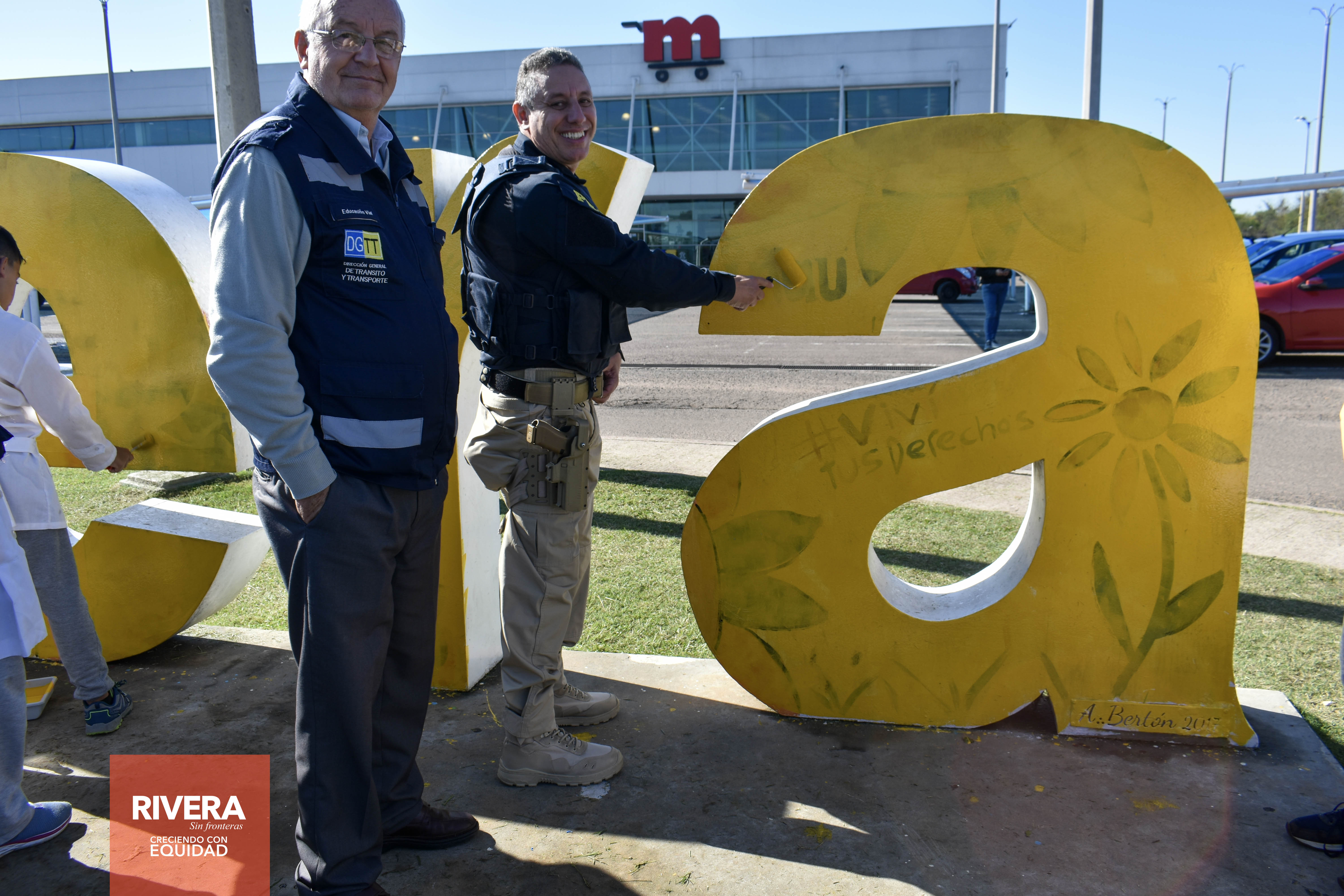 En horas de la mañana del martes 9 de mayo, alumnos y docentes de la escuela Nº 112 de barrio Bisio, autoridades de Educación primaria de la Dirección General de Tránsito y de instituciones asociadas, pintaron un lazo en la entrada del supermercado Macro Mercado y las letras corporeas que forman la palabra RIVERA en color amarillo.