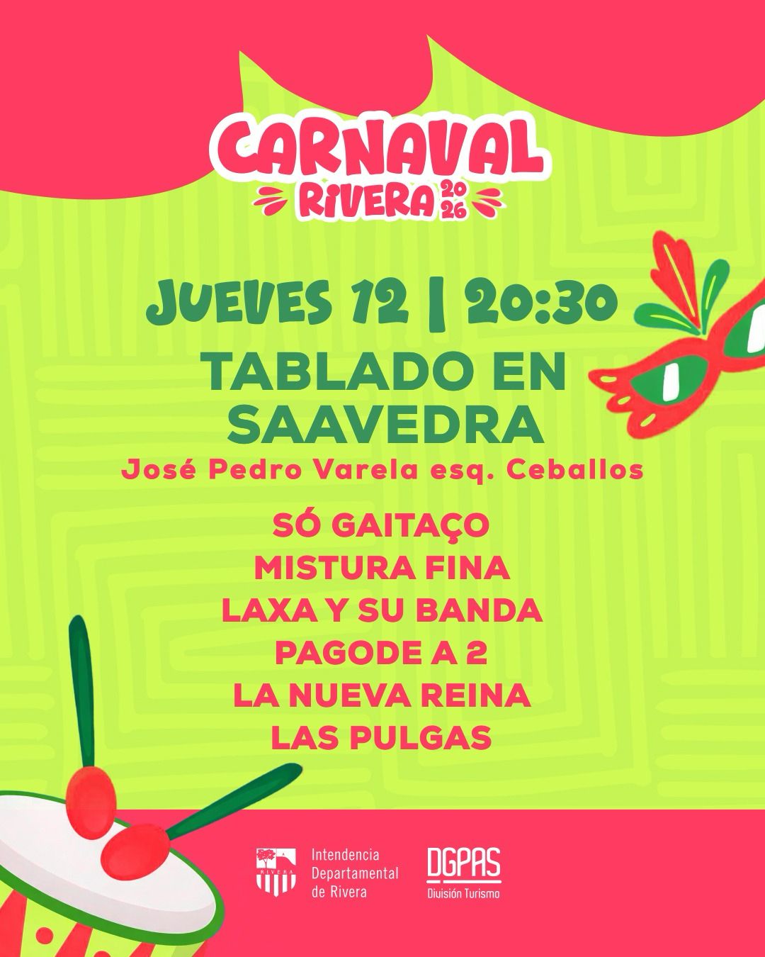 La Intendencia Departamental de Rivera, a través de la División Turismo (DGPA), invita a la comunidad a disfrutar de una nueva jornada del Carnaval Rivera 2026, que se llevará a cabo este jueves 12 a las 20:30 horas en el Tablado en Saavedra, ubicado en José Pedro Varela esquina Ceballos.