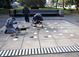 Por su parte el Asesor de la Unidad de Ordenamiento Territorial y de la Unidad de Proyectos, Arq. Leónidas Bayo, explicó que se está realizando la sustitución de las platinas que rodea los chorros de aguas y en su lugar se está colocando tapas de PVC.