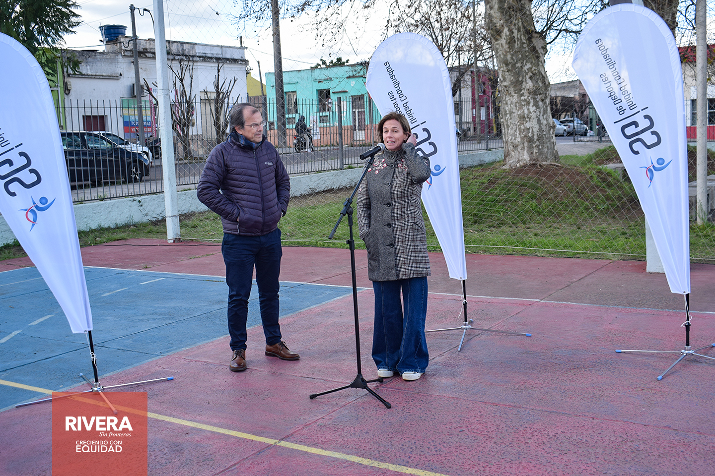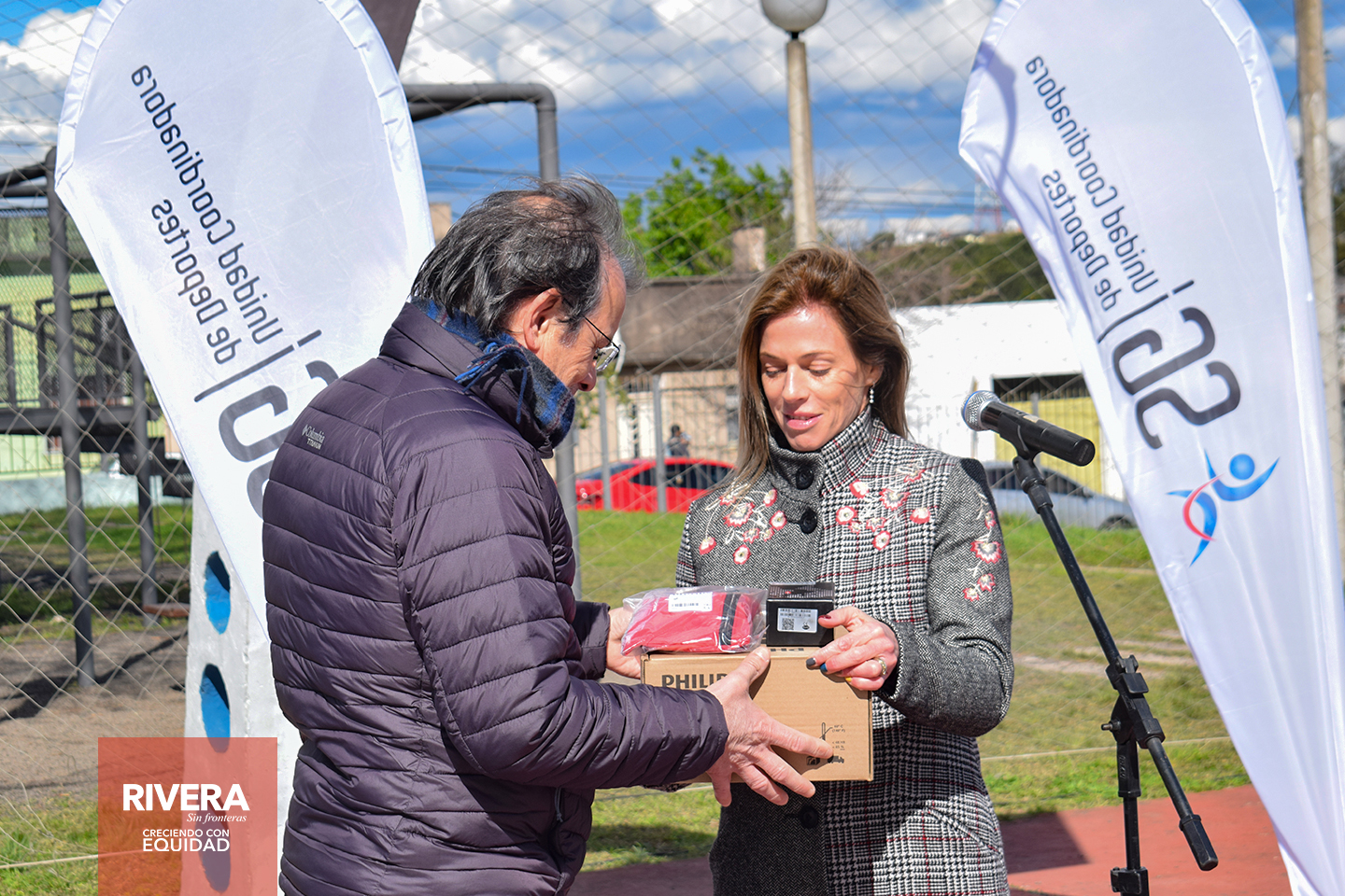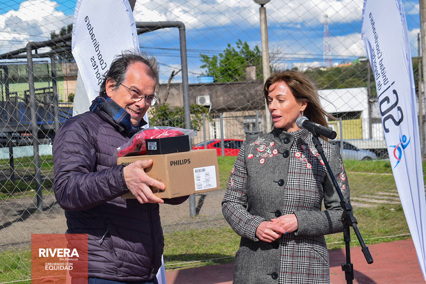 En horas de la tarde del día jueves 18 de agosto, en instalaciones del Complejo Polideportivo Don Bosco, el Intendente departamental de Rivera, junto al director de la Unidad Coordinadora de Deportes, reciben de mano de la presidente de la organización público – privada “Unidos para Ayudar”, Lic. Lorena Ponce de León, una donación para el Complejo.