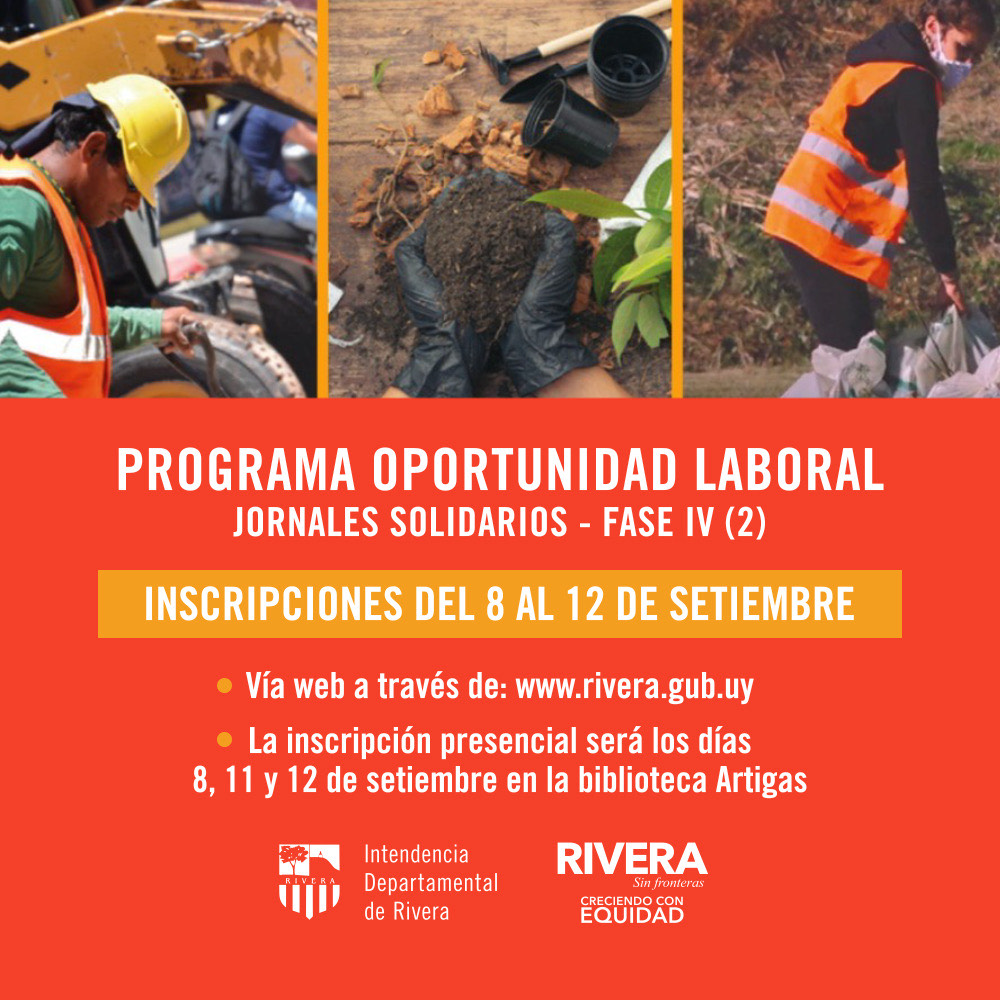 El programa Oportunidad Laboral abre inscripciones este viernes 8 de setiembre y los riverenses a quienes está dirigido el llamado podrán inscribirse vía web en la página oportunidadlaboral.gub.uy o presencialmente, en el horario de 8:30 a 14:30, el viernes 8, lunes 11 y martes 12 en la Biblioteca Artigas, en Uruguay esquina Artigas.