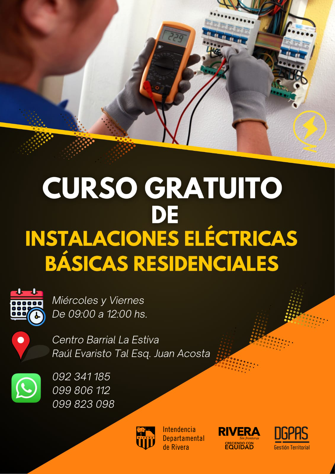 La Intendencia Departamental de Rivera, a través de la Div. Gestión Territorial de la Dirección General de Promoción y Acción Social, promueve e invita a un Curso Gratuito de Instalaciones Eléctricas Básicas Residenciales, que se brindará los días miércoles y viernes de 09:00 a 12:00 hs. en el Centro Barrial La Estiba – calle Raúl Evaristo Tal esq. Juan Acosta, barrio La Estiba.