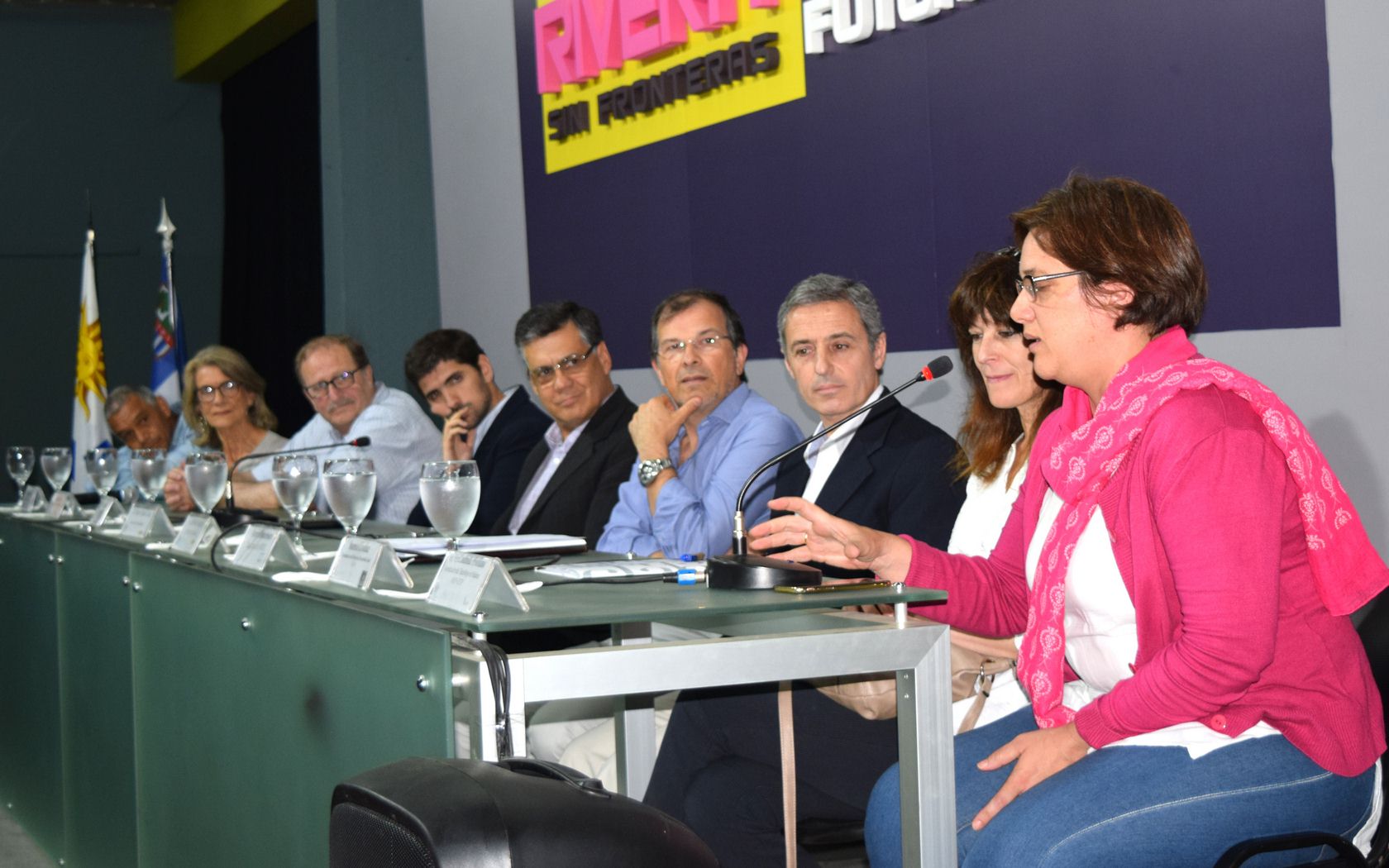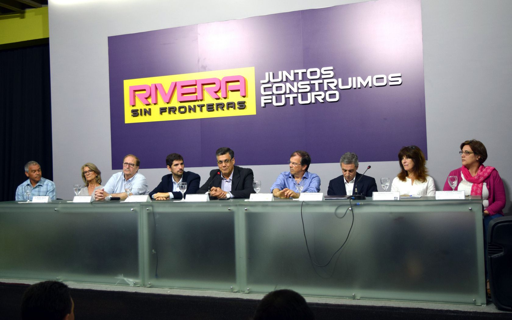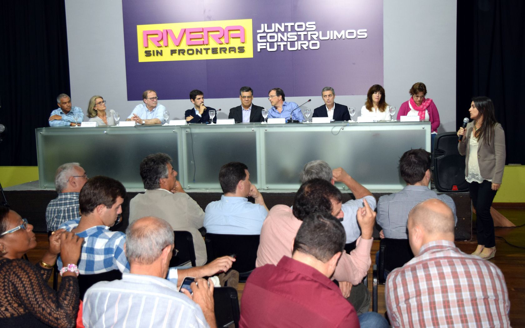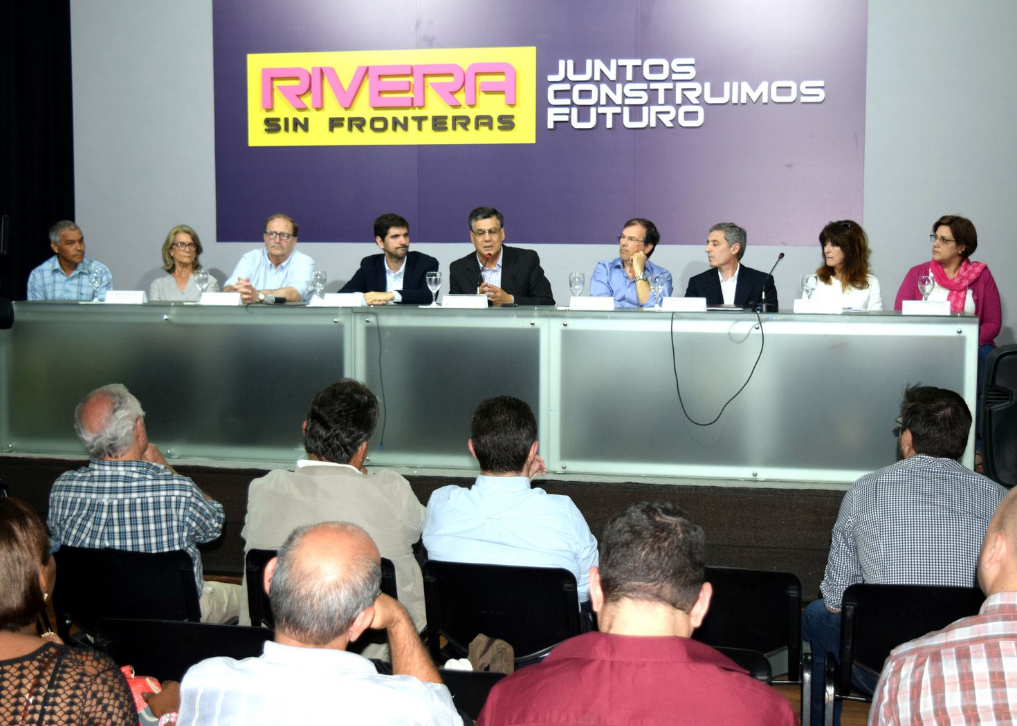 Estuvieron presentes en mesa de conferencia el intendente departamental de Rivera, Dr. Marne Osorio Lima, Secretario General IDR, Cr. Richard Sander, Presidente de Agencia Nacional de Desarrollo (ANDE), Sr. Martín Dibarboure, Representante de la Oficina de Planeamiento y Presupuesto (OPP), Santiago Soto, Director Nacional de DINAPYME- MIEM, Rafael Mendive, Coordinadora del Centro de Extensionismo Industrial, (CEI),Ec. Michele Snoek, Coordinadora del Programa Desarrollo Local de Centro Latinoamericano de Economía Humana (CLAEH), Ioanna Grotiuz, Representante del Sector Privado de Aserraderos de Rivera, Sr. Juan Carlos Sanguinet, y la Coordinadora de Tecnólogo en Madera, ANEP-CETP, Ing. Agr. Ludmila Profumo.