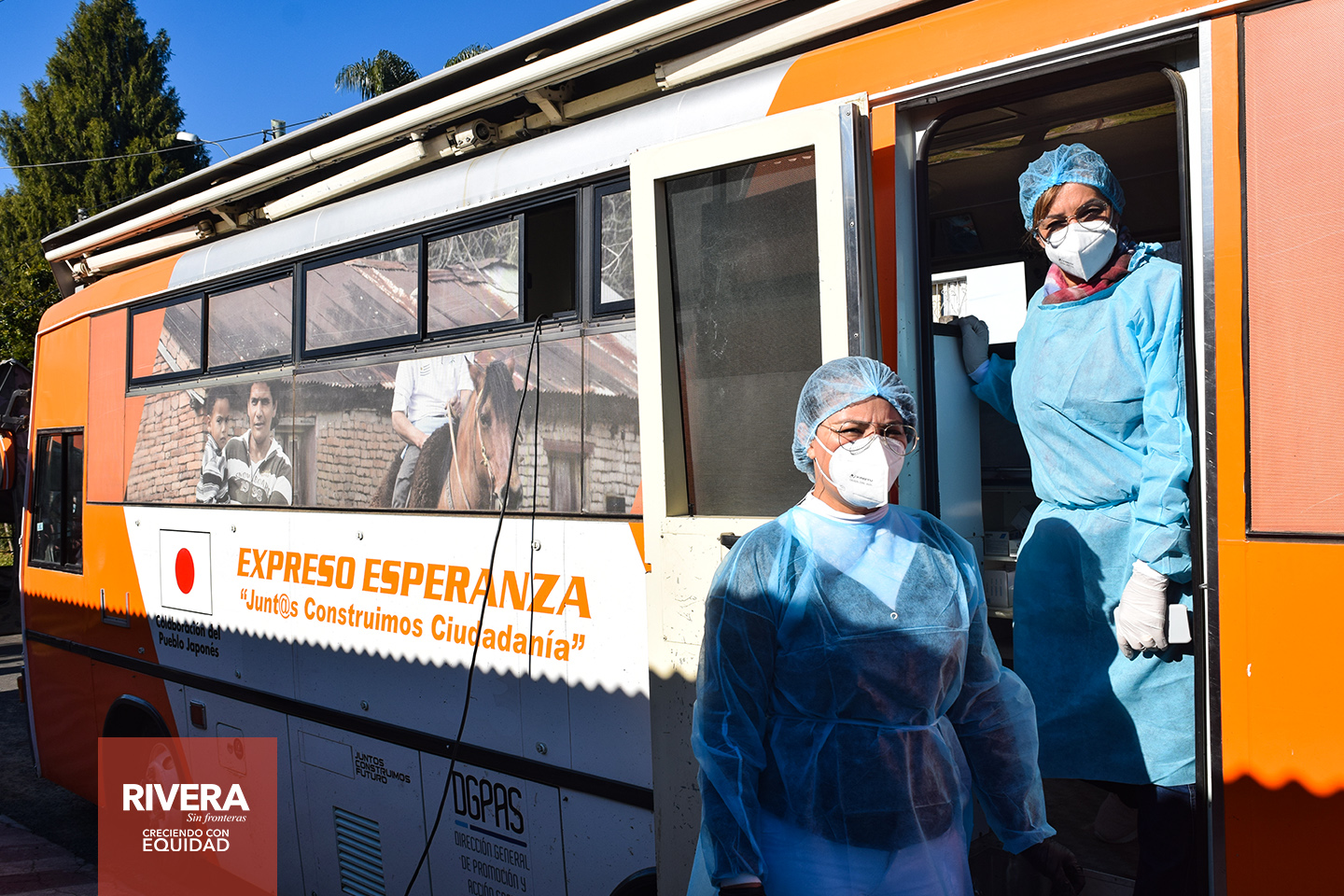 A primera hora visitó el vacunatorio móvil instalado en plaza Artigas, el que confirmó el éxito por el alto porcentaje de jóvenes que se acercaron a recibir la primera dosis.