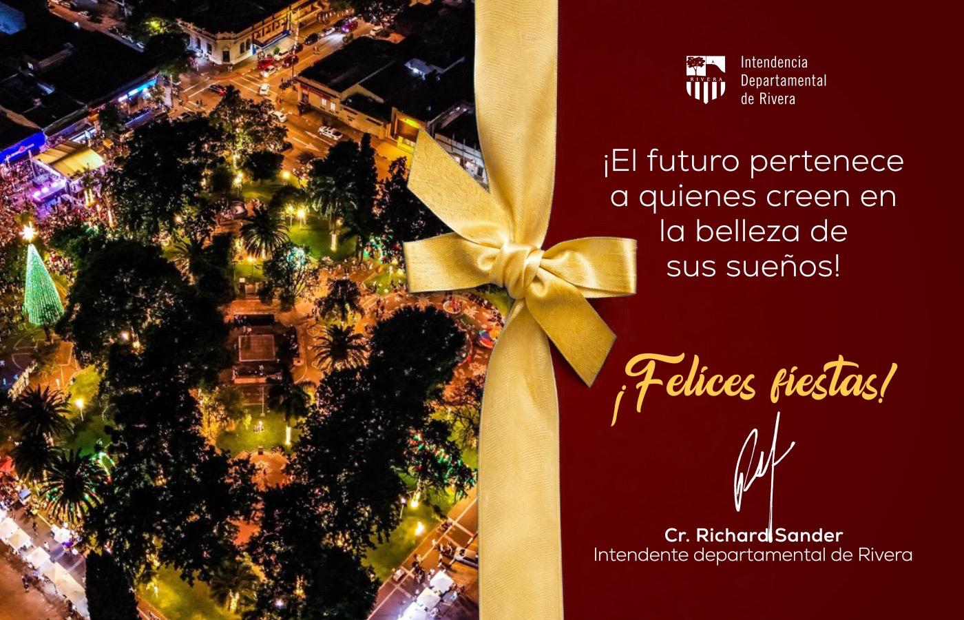 Felices Fiestas! 24 diciembre, 2025 En estas fiestas, el Intendente Departamental, Cr. Richard Sander Darín, hace llegar su saludo a toda la comunidad, renovando el compromiso con los sueños, la esperanza y el futuro de Rivera. Share on TwitterTweet Share on LinkedIn Share Send email Mail Print Print