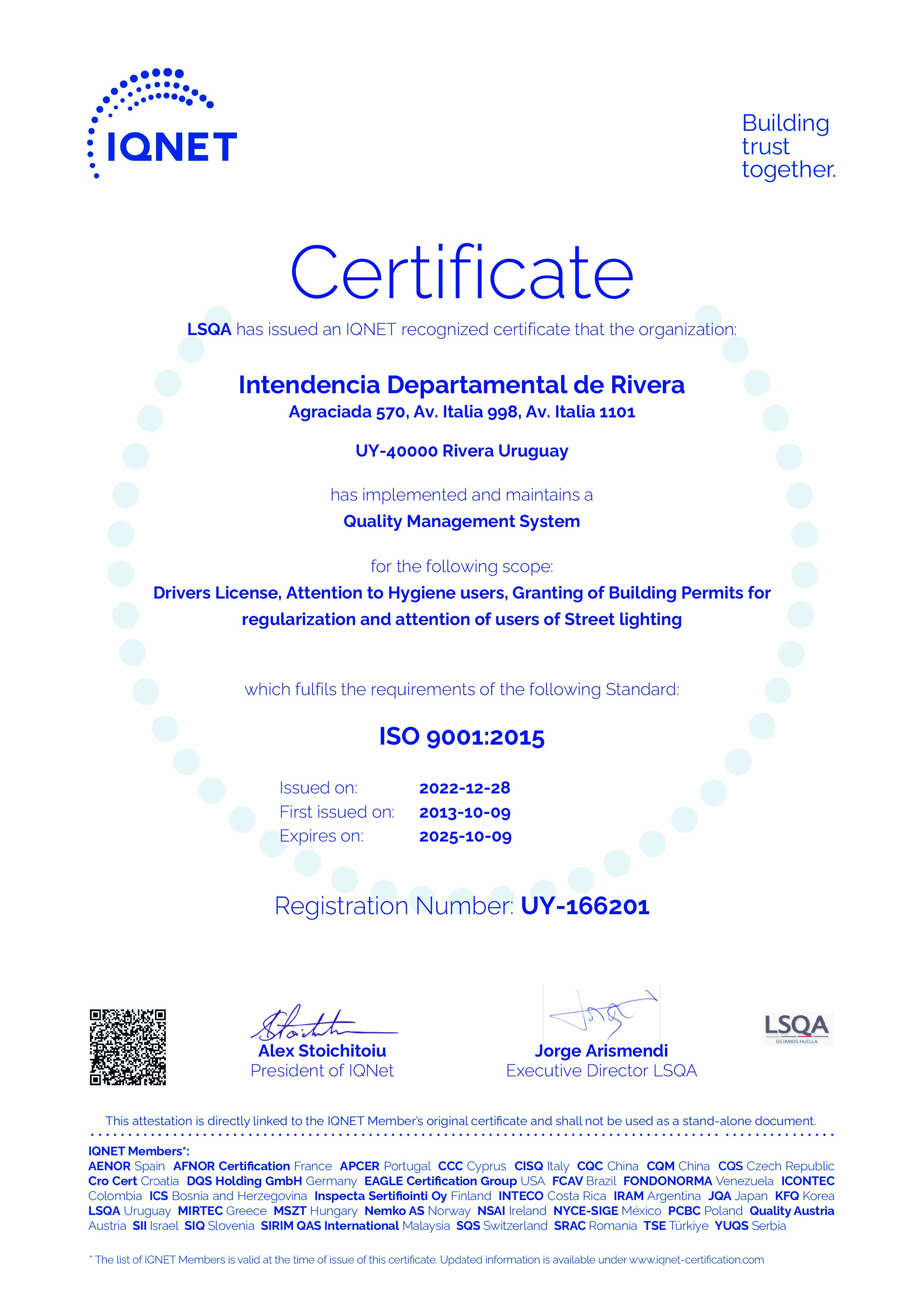 Junto al Certificado que expidiera LSQA con fecha 28 de diciembre de 2022, recibimos el de IQNet, que es una entidad certificadora de ámbito internacional, que agrupa a más de 30 de los principales organismos certificadores de diferentes países.
