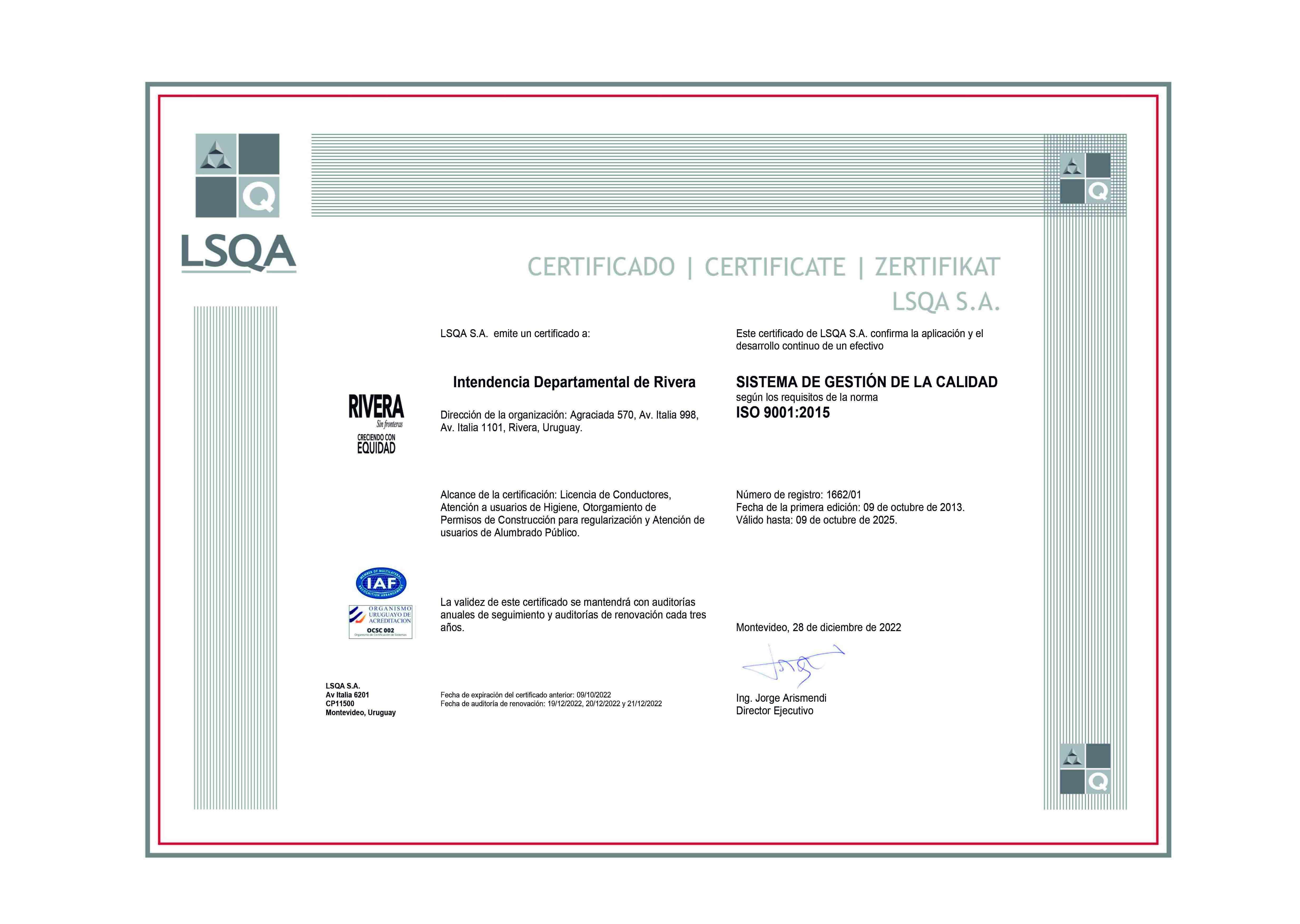 La Unidad de Gestión de Calidad dependiente de Secretaría General, desde el 2012 con el asesoramiento del LATU, implementó un Sistema de Gestión de Calidad en el marco de la Norma ISO 9001, involucrando a más de cien funcionarios de nueve áreas de dirección, ejecución y apoyo.