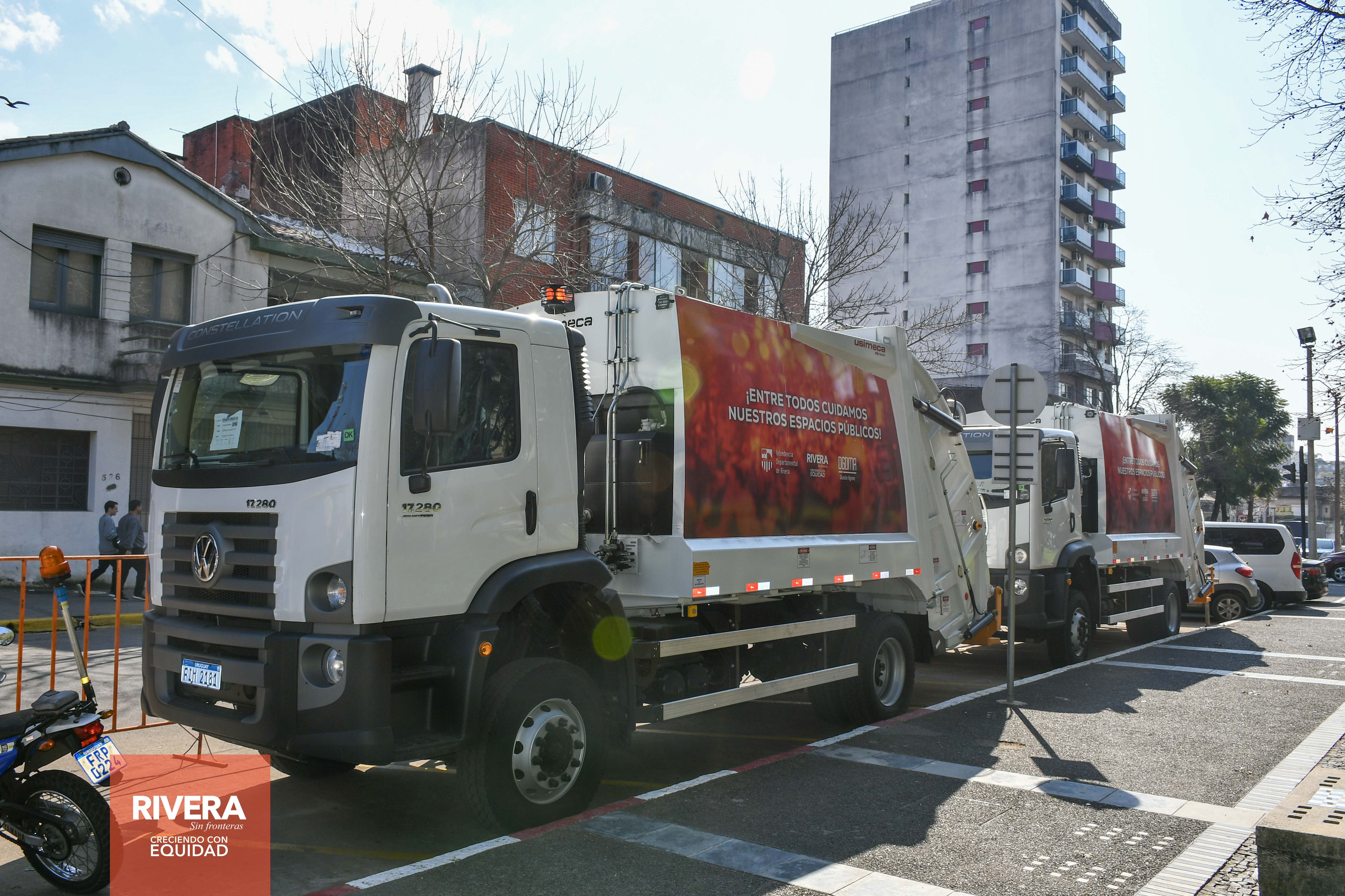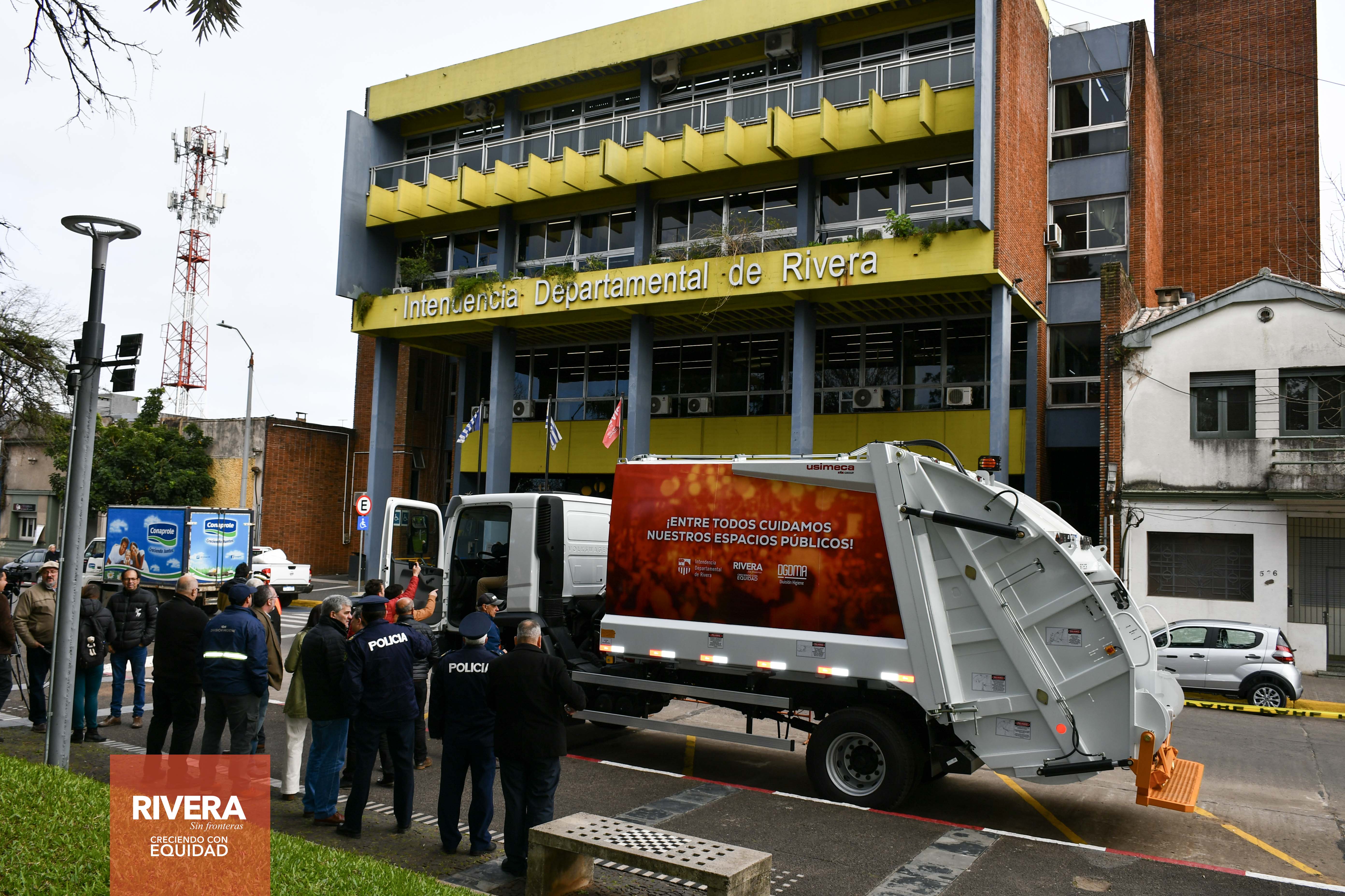El intendente de Rivera, Cr. Richard Sander Darín, acompañado por el secretario General de la IDR, Arq. José Mazzoni Gollardía y el director General de Desarrollo y Medio Ambiente, Qim.Far. Alejandro Bertón Solé, presentó ésta mañana a la sociedad, 2 nuevas unidades cero km, Camión Recolector de Residuos (unidad equipada con una carrocería con capacidad para recolectar toneladas de residuos sólidos), adquiridas por el gobierno departamental para los trabajos de limpieza y recolección en el departamento.