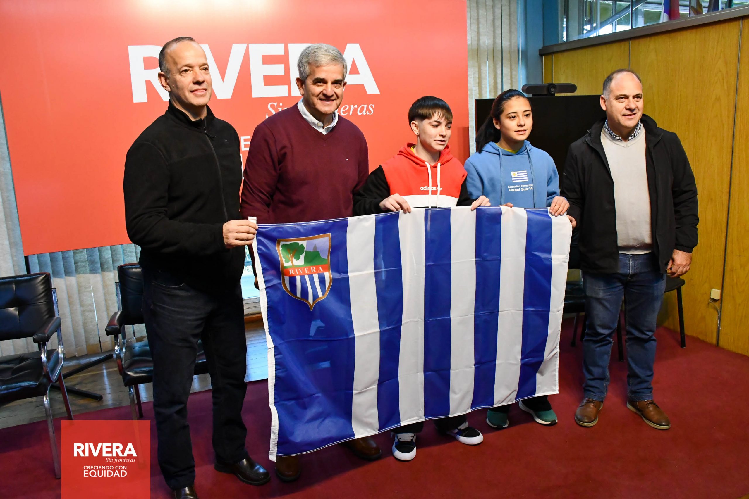 Esta mañana, en la Sala de Conferencias de la IDR, el intendente de Rivera, Arq. José Mazzoni Gollardía, hizo entrega de la bandera de Rivera a las atletas riverenses integrantes de la Selección Uruguaya de Fútbol Femenino, categoría Sub-14, que participará del torneo USA CUP 2025, en los Estados Unidos de América, durante este mes de julio.