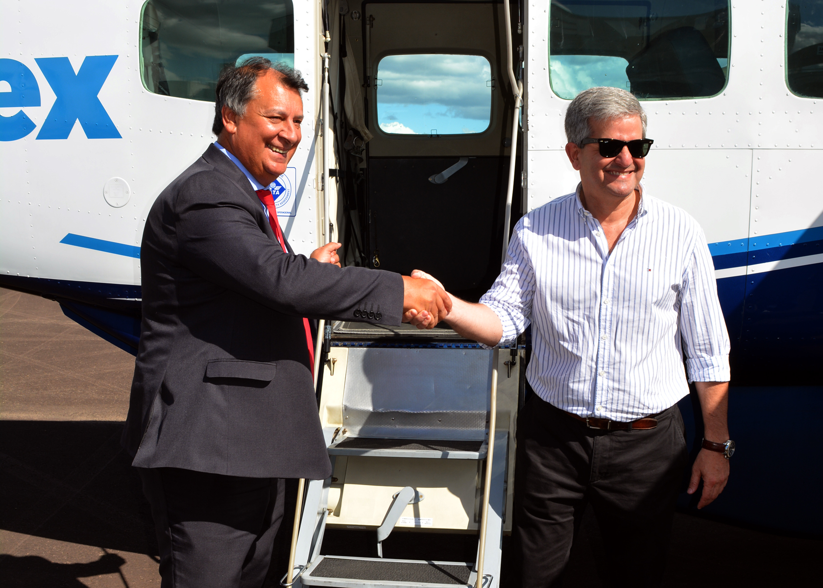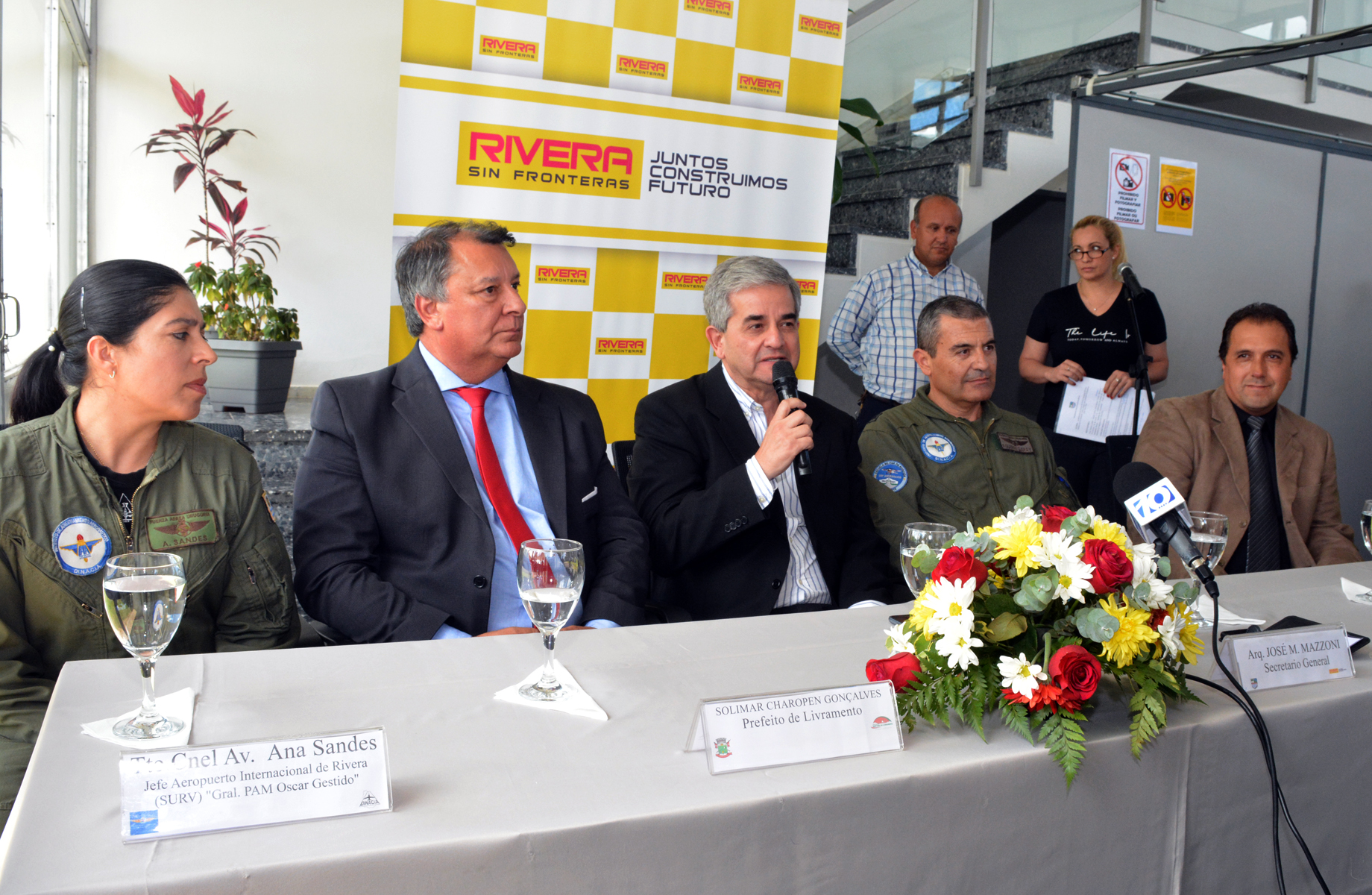 Conformaron la mesa junto al jefe Comunal, el director General de Infraestructura Aeronáutica, Cnel (Av) Eduardo Aguirregaray, el prefeito del Municipio de Santana do Livramento, Solimar Charopen, la jefa Regional de Aeropuertos (Artigas, Tacuarembó y Rivera), Tte. Cnel (Nav) Ana Sandes y el representante legal de la Empresa Two Flex en Uruguay, Dr. Charles Da Silva.