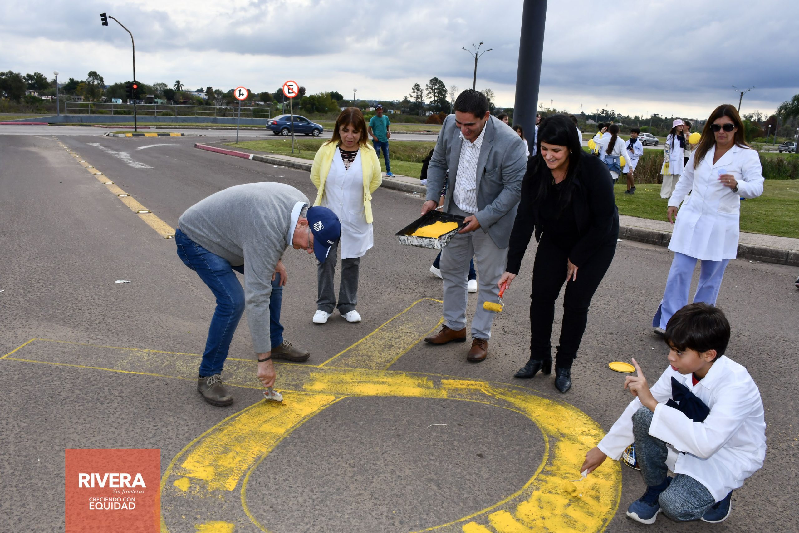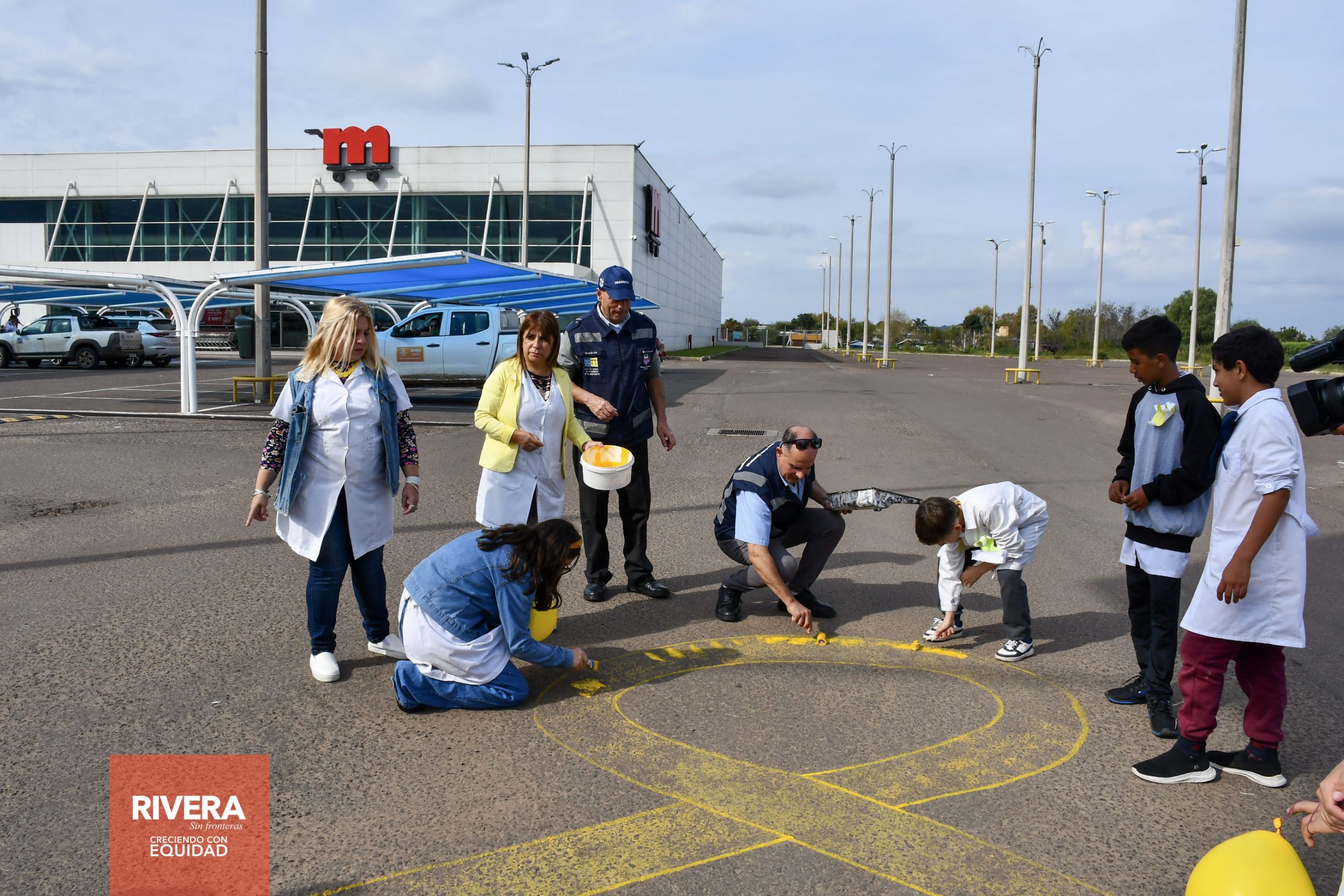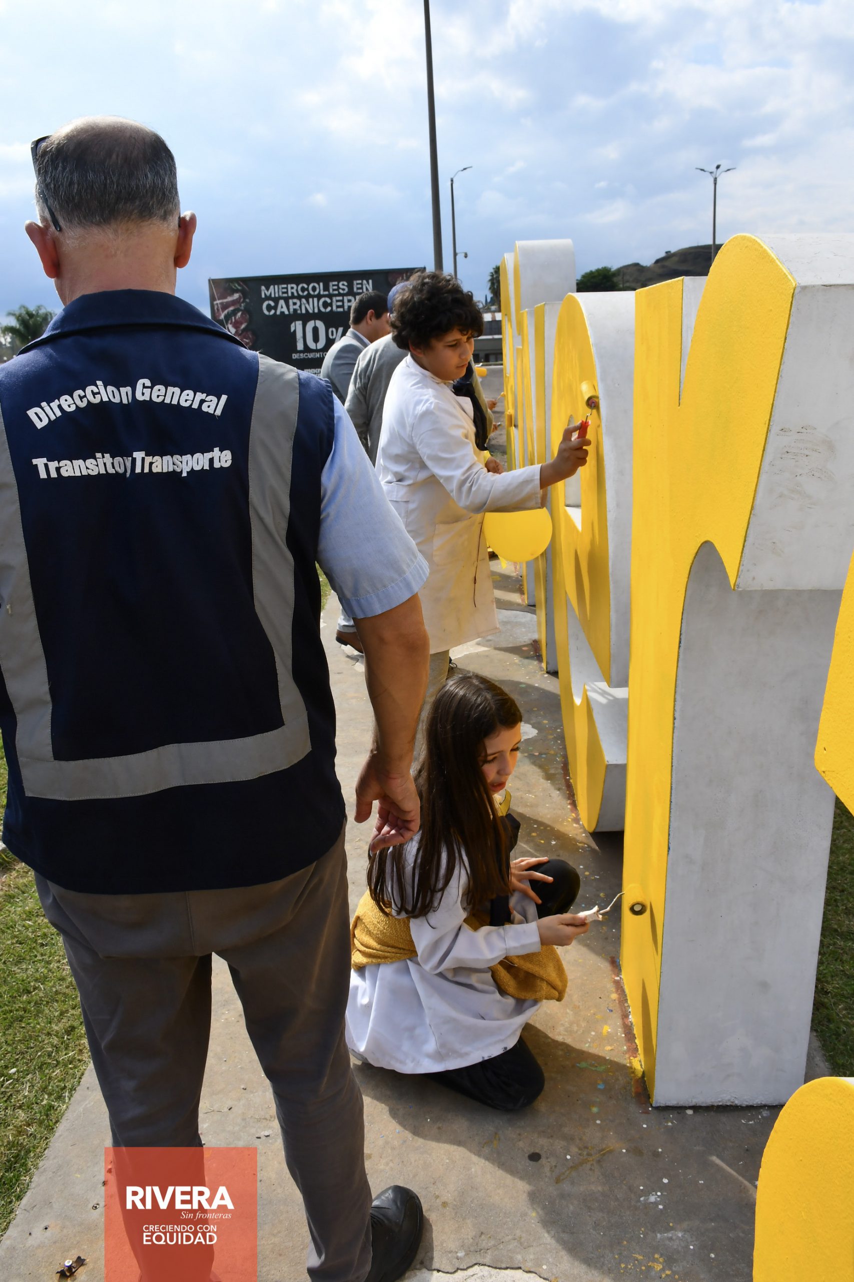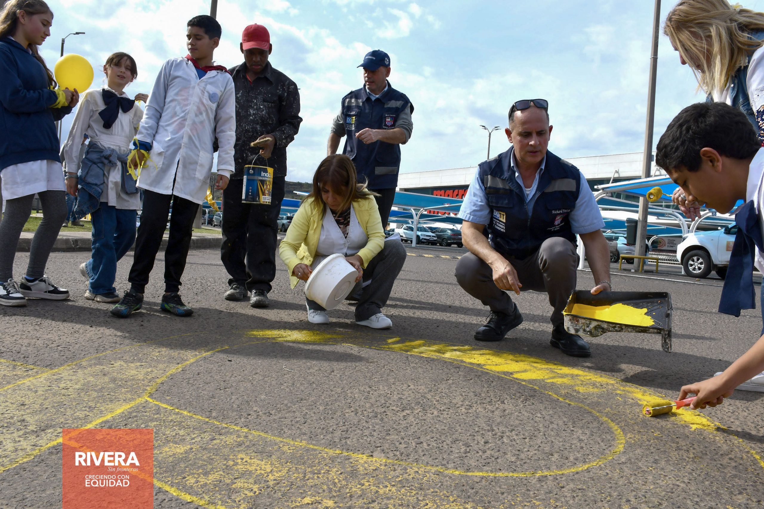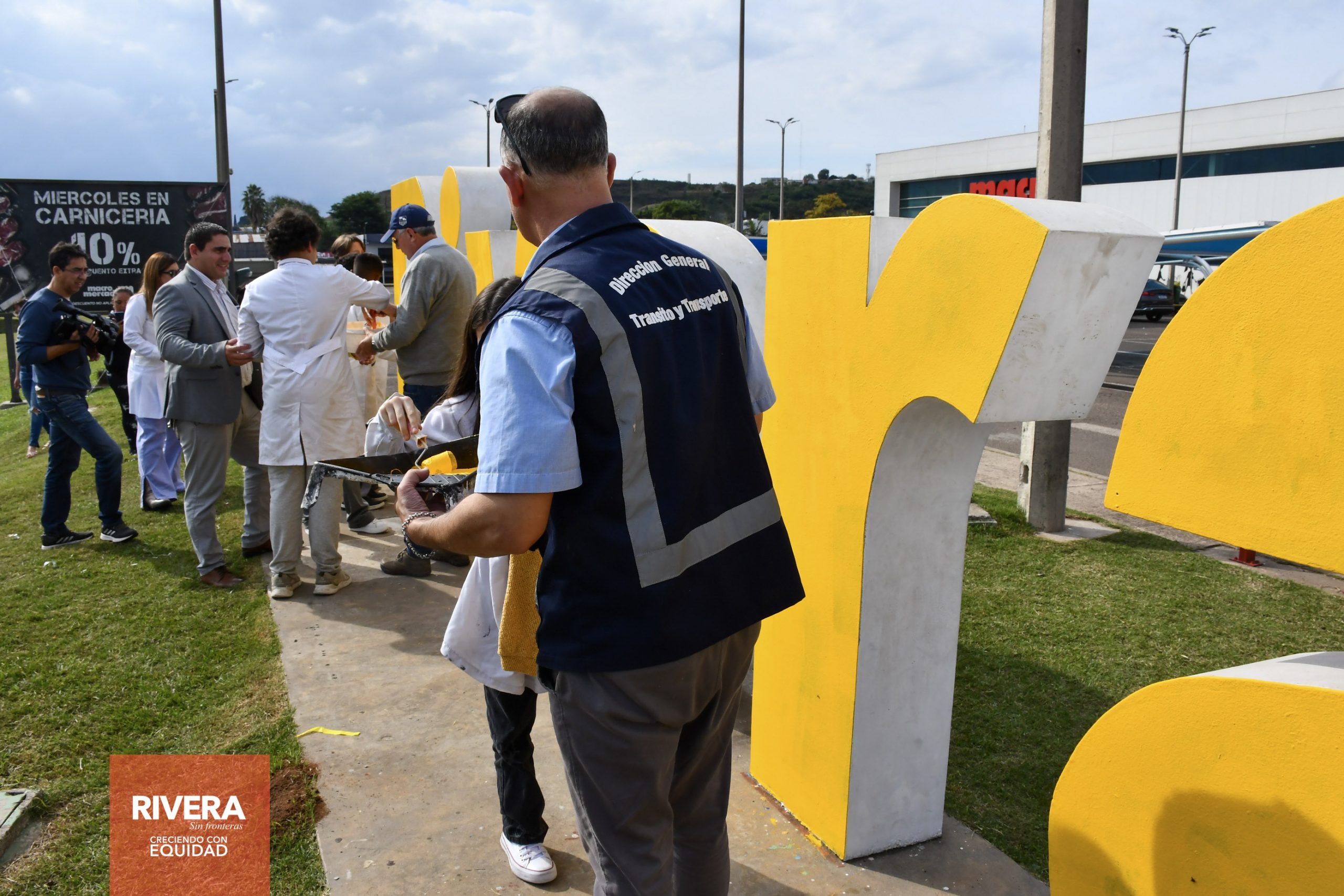 En horas de la tarde de hoy, alumnos y docentes de la escuela Nº 44 República de Italia, autoridades de la Dirección General de Tránsito y Transporte y de instituciones asociadas, pintaron un lazo en la entrada del supermercado Macro Mercado y las letras corpóreas que forman la palabra RIVERA en color amarillo dentro del marco de Mayo Amarillo 2025.Las actividades relacionadas a la prevención de siniestros de tránsito, se realizan en la ciudad de Rivera y en las alcaldías durante el mes de mayo.