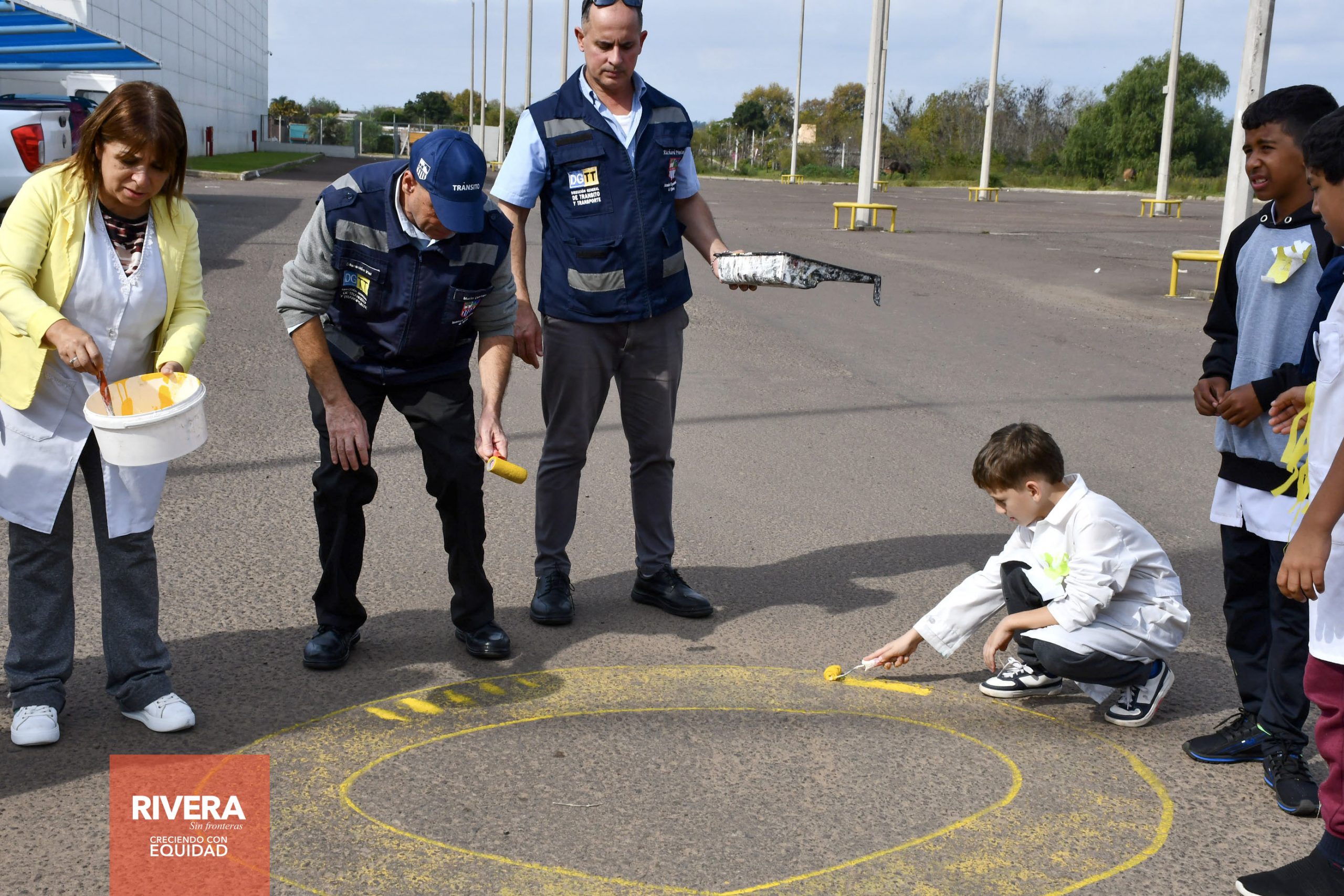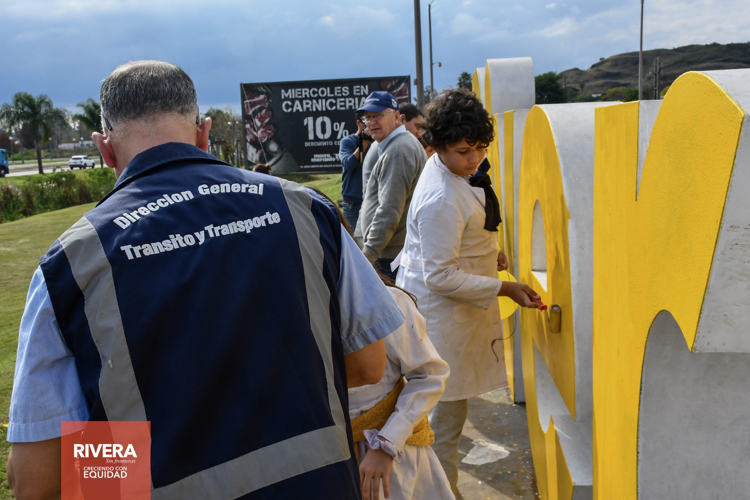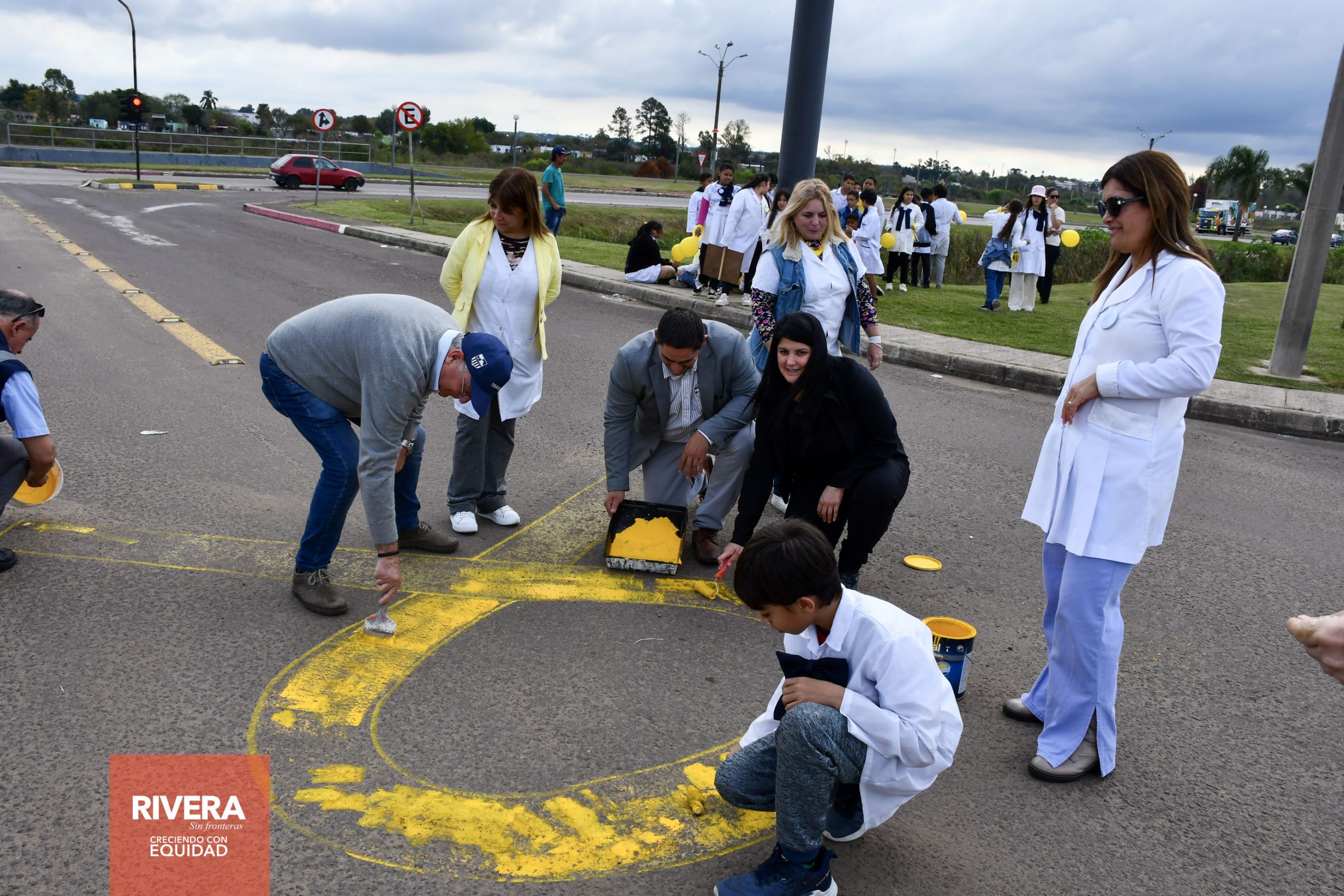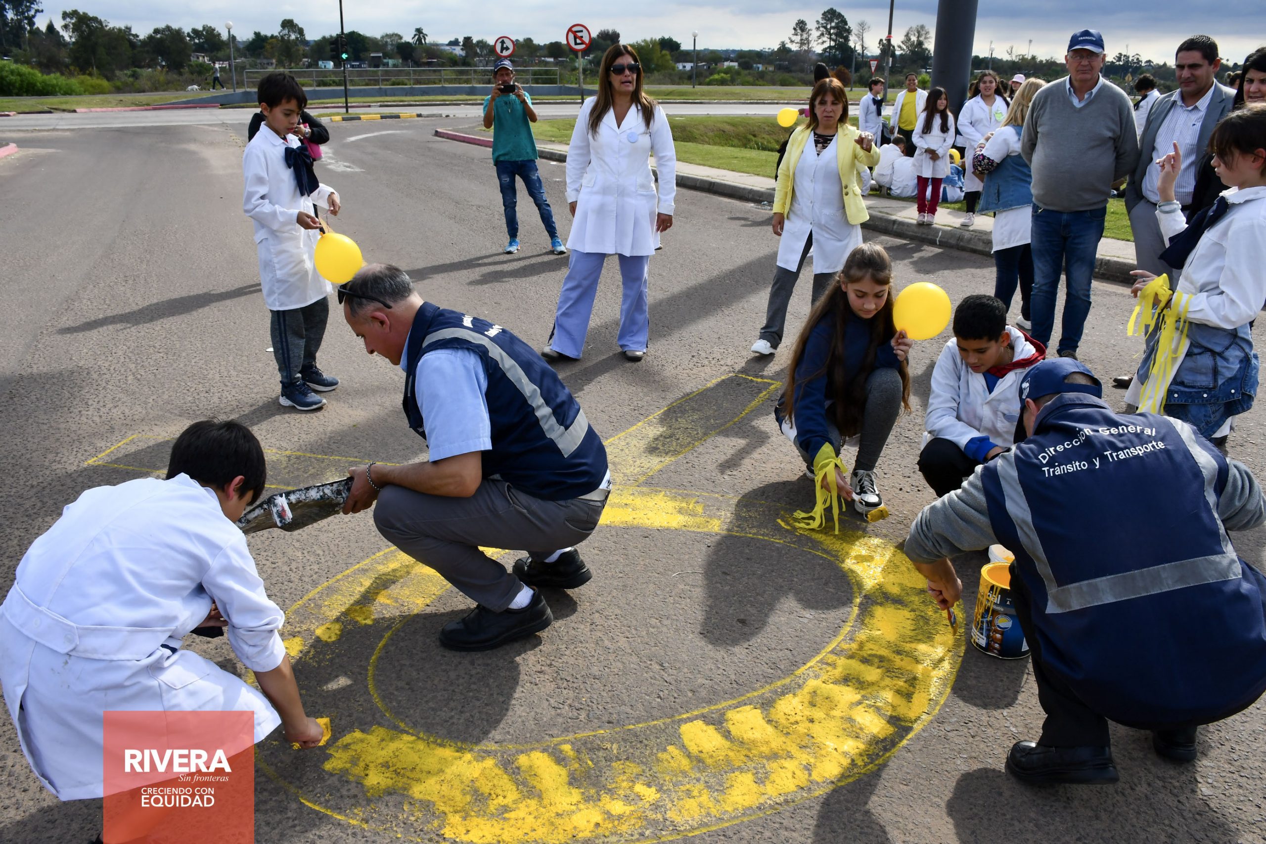 En horas de la tarde de hoy, alumnos y docentes de la escuela Nº 44 República de Italia, autoridades de la Dirección General de Tránsito y Transporte y de instituciones asociadas, pintaron un lazo en la entrada del supermercado Macro Mercado y las letras corpóreas que forman la palabra RIVERA en color amarillo dentro del marco de Mayo Amarillo 2025.Las actividades relacionadas a la prevención de siniestros de tránsito, se realizan en la ciudad de Rivera y en las alcaldías durante el mes de mayo.