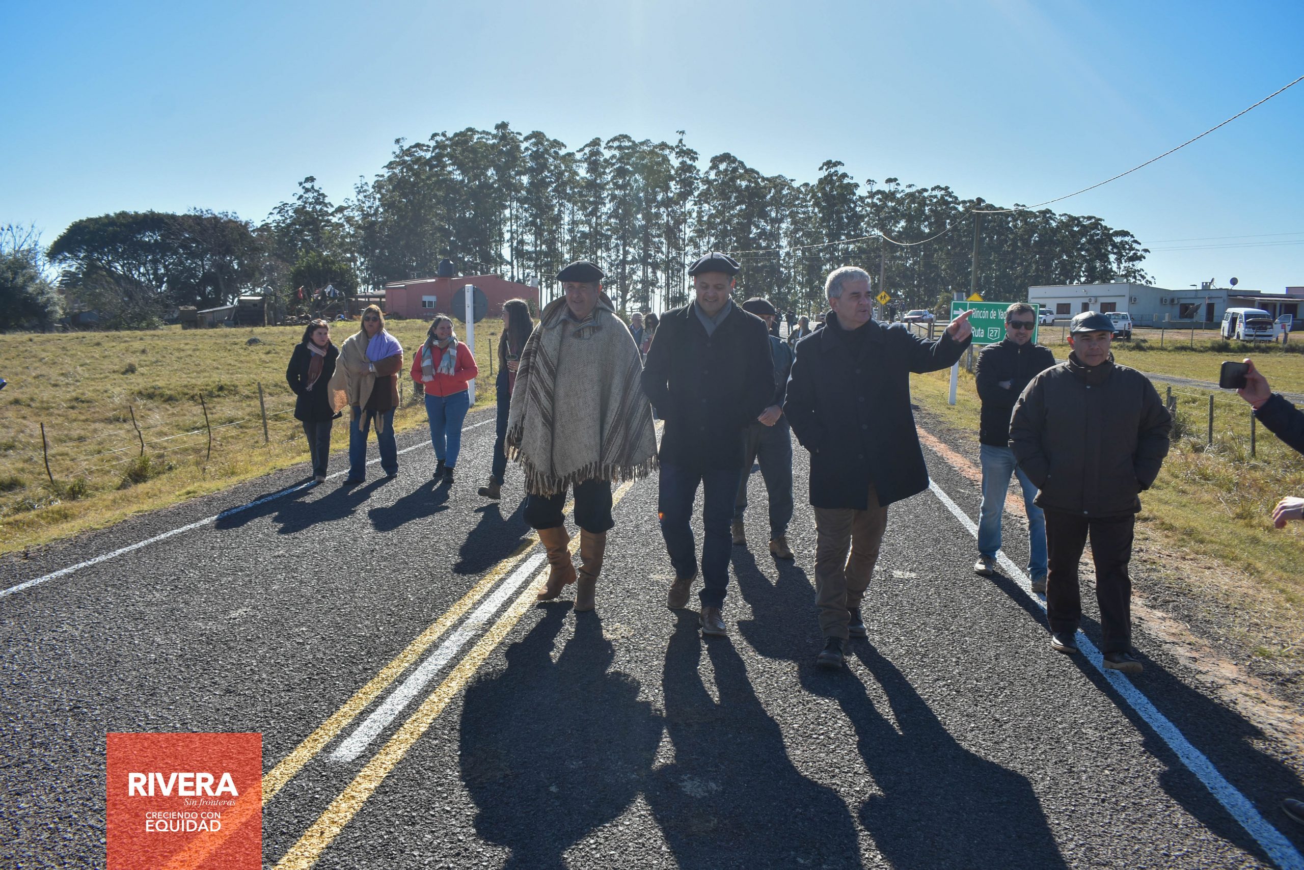 El primer tramo que hicimos fue desde la Ruta Nº 27 hasta La Puente, unos 18 km aproximadamente; luego desde la Ruta Nº 27 hasta Amarillo, 7 km; y ahora, de Amarillo a Minas de Cortume, que son 15 km y que estamos inaugurando hoy. Actualmente estamos trabajando en otros 15 km más, que van desde Minas de Cortume hasta Las Flores y la Ruta Nº 44. Así que, en todo este eje, desde La Puente hasta Las Flores, la gente va a poder circular tranquilamente: el ómnibus, el transporte, los vecinos, que a veces son quienes más dificultades tienen.