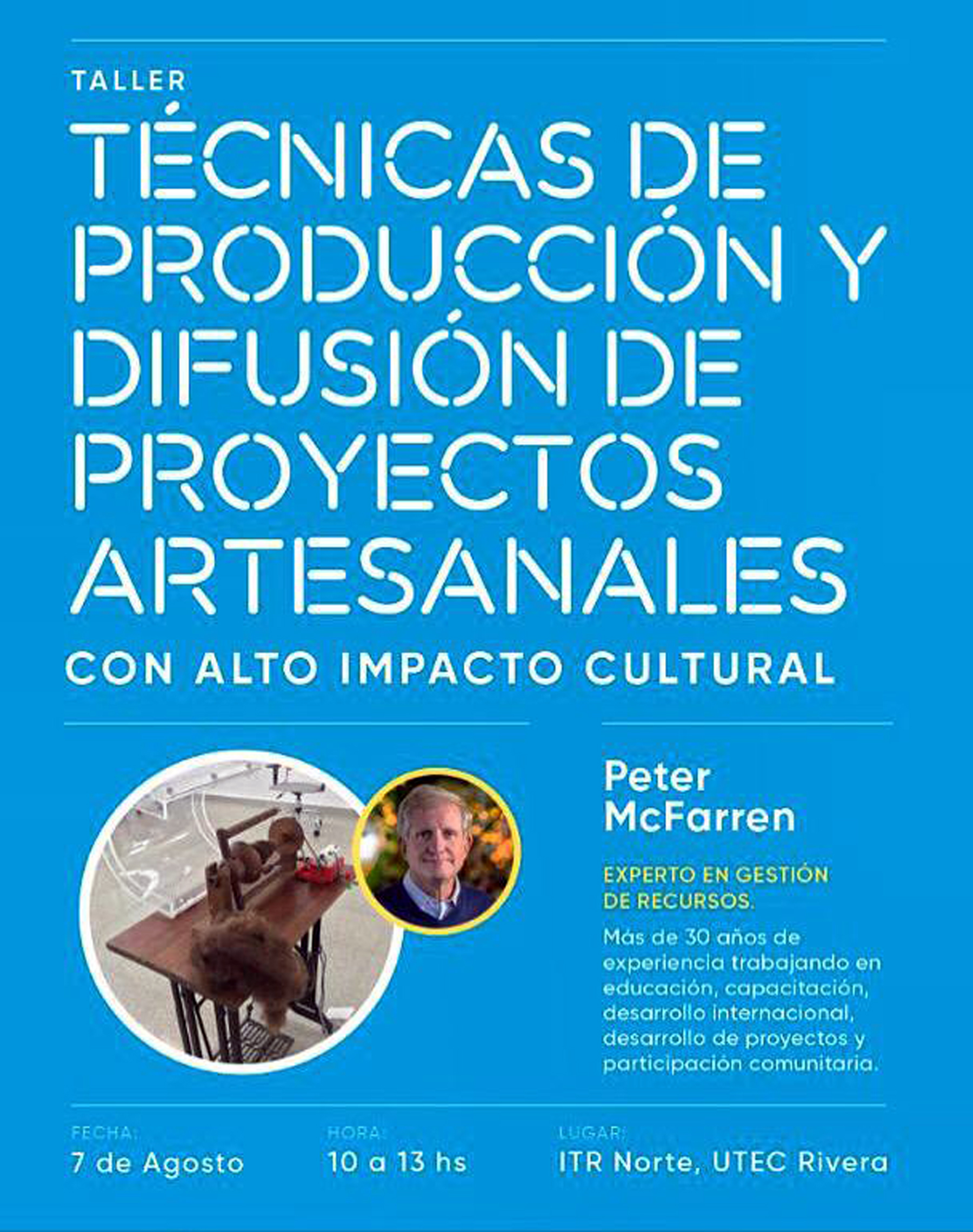 En la jornada del día miércoles 7 de agosto, se realizó en UTEC Rivera, una jornada sobre Técnicas de Producción y Difusión de Proyectos Artesanales, dictada por el especialista Peter McFarren (ciudadano estadounidense y boliviano), experto en Gestión de Recursos, enmarcado en el proyecto presentado por la Oficina de Inclusión Social (perteneciente a la Dirección General de Desarrollo y Medio Ambiente, de la IDR); conjuntamente con el proyecto Flordelana, el curso de Mecatrónica y la Embajada de Estados Unidos (EEUU).