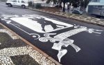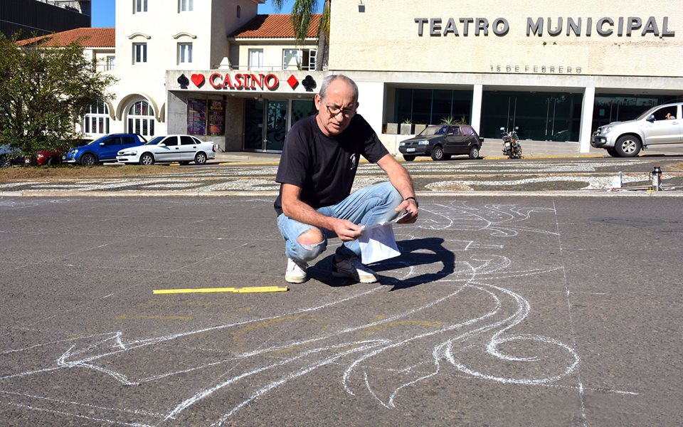 “El diseño es una pareja bailando Tango, enmarcada en un “Filete Porteño”, una especie de guarda con cintas que marcan las fechas y el nombre La Cumparsita para la gente que no sepa, se de cuenta de que se trata. La idea es ejecutarla con pintura blanca para pisos, -mucha pintura blanca-, como el asfalto ya es oscuro contrasta bien. La obra tiene una dimensión de ocho metros por seis metros y para diseñar se uso el viejo estilo Leonardo Da Vinci, cuadriculando la superficie y trabajando por cuadros para quedar proporcional”