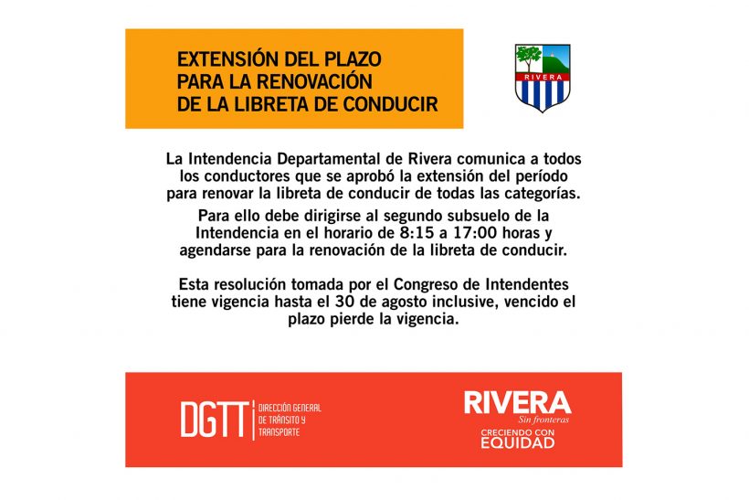 La Intendencia de Rivera informa la nueva prórroga que se extiende hasta el 30 de agosto de 2022, para todos los contribuyentes que tengan su licencia de conducir vencida y estén esperando su turno para renovarla.