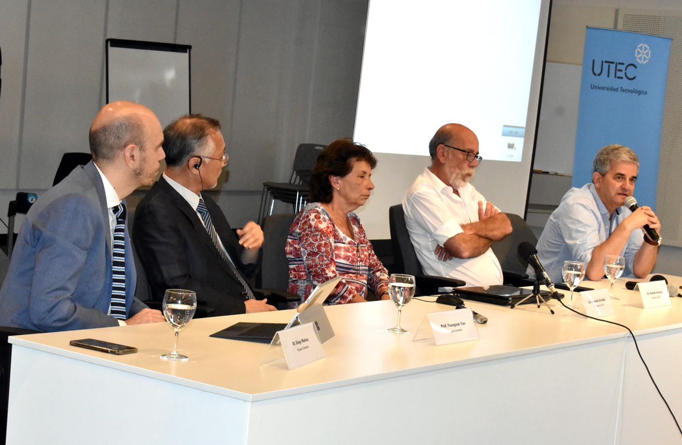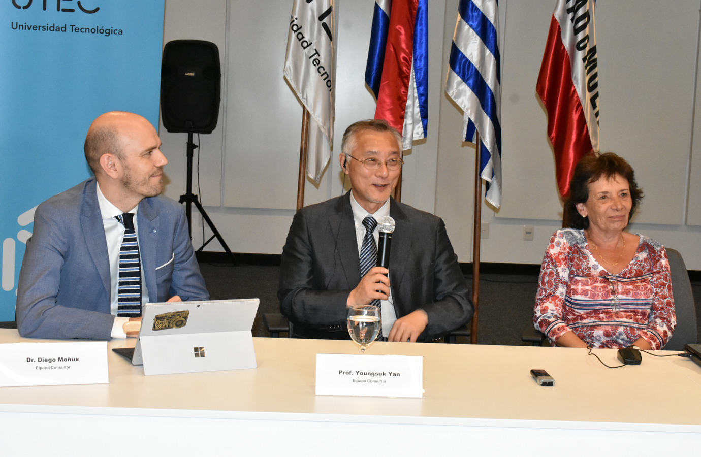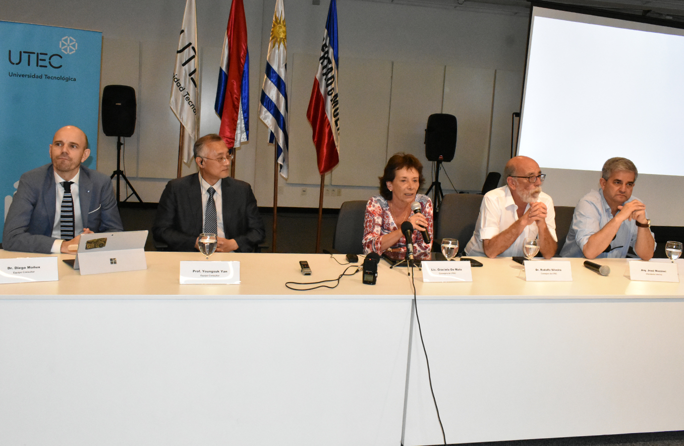 En la conferencia de Prensa, la mesa la conformaron el Intendente Departamental, el Prof. Yang y Dr. Diego Moñux (consultores), consejeros de la UTEC, Graciela Do Mato y Rodolfo Silveira.