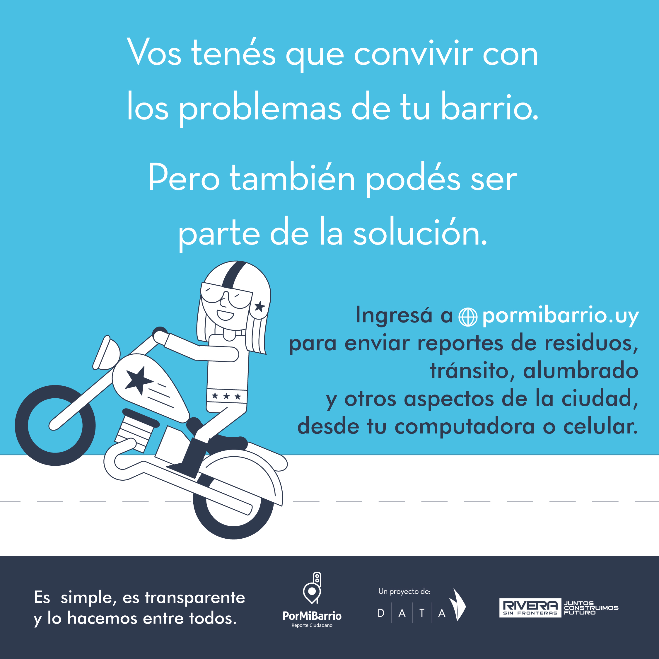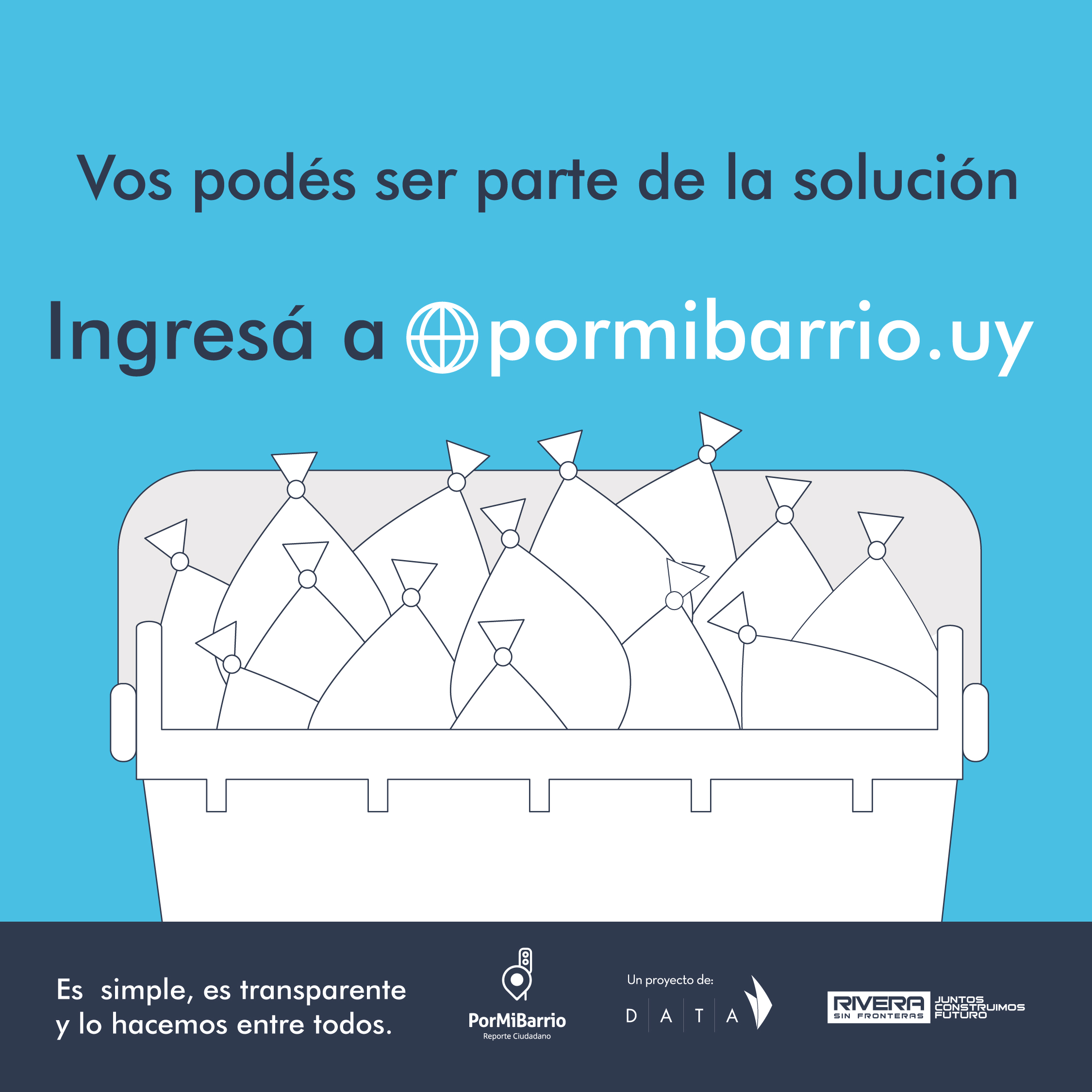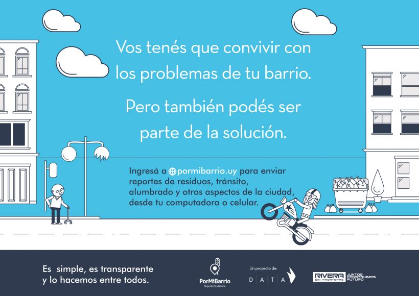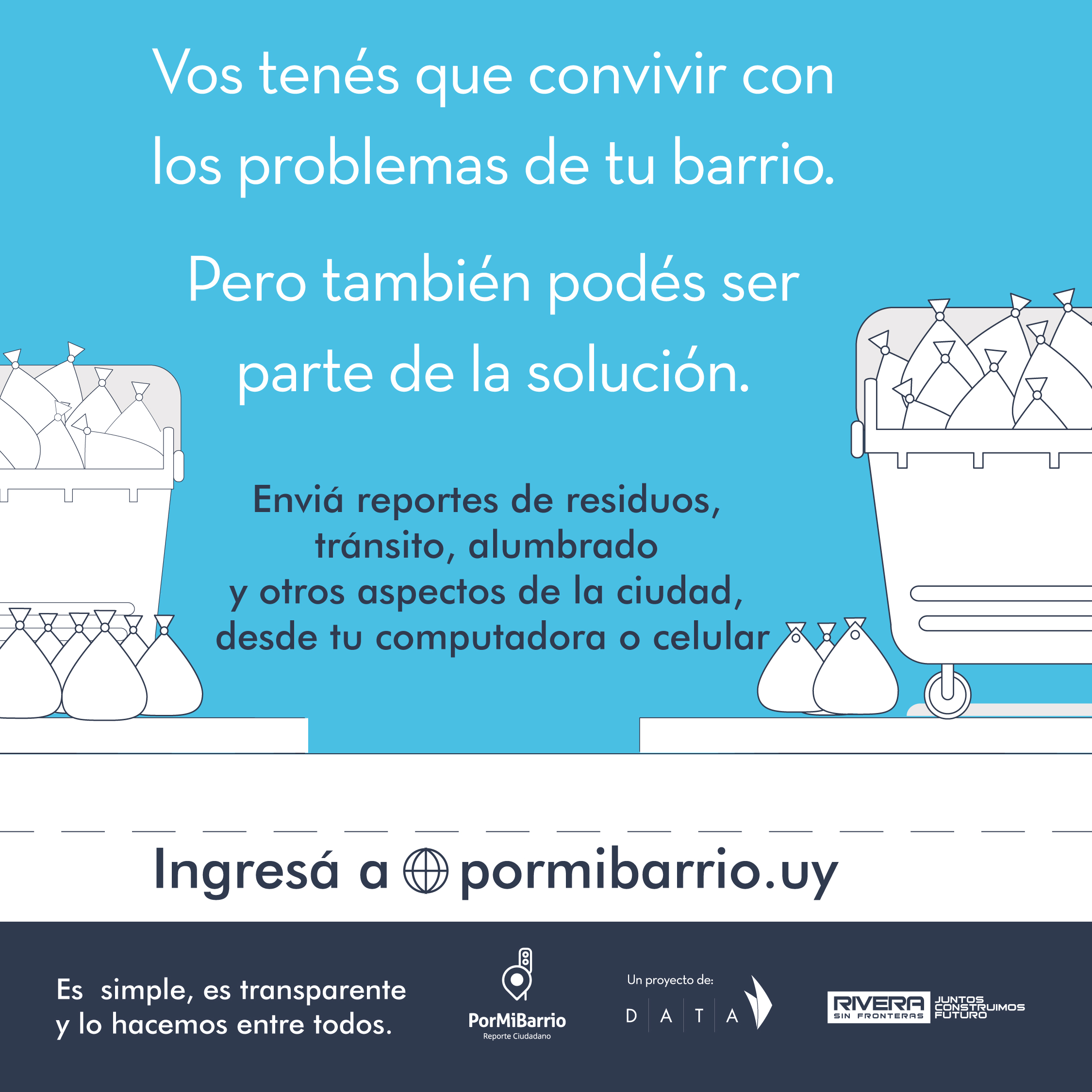 Por mi barrio es una plataforma para hacer reportes por residuos, tránsito, barrido, alumbrado y problemas que veas en la ciudad junto a vecinos y vecinas, manteniéndote al tanto del proceso de reparación. Lo llevamos adelante desde DATA (una organización de la sociedad civil) en conjunto con la IDR y vecinos de Rivera.