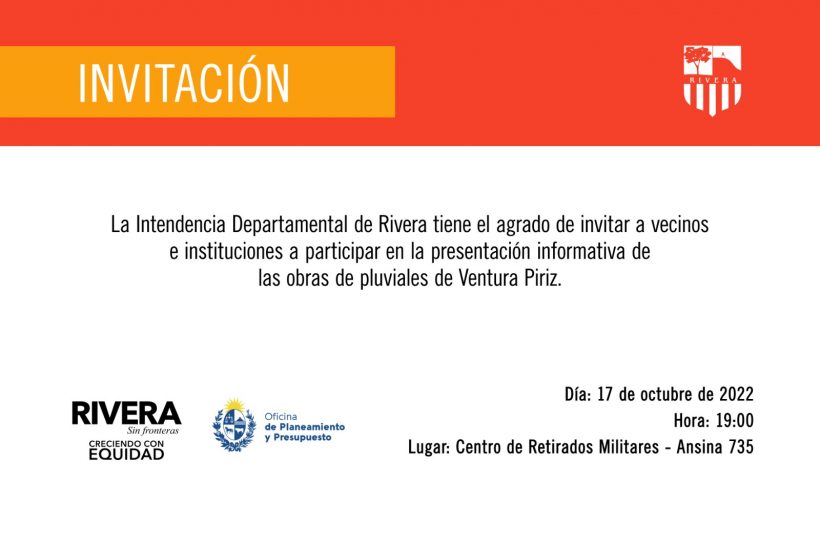 La Intendencia de Rivera invita a participar en la presentación informativa de las obras pluviales de calle Ventura Piriz.
