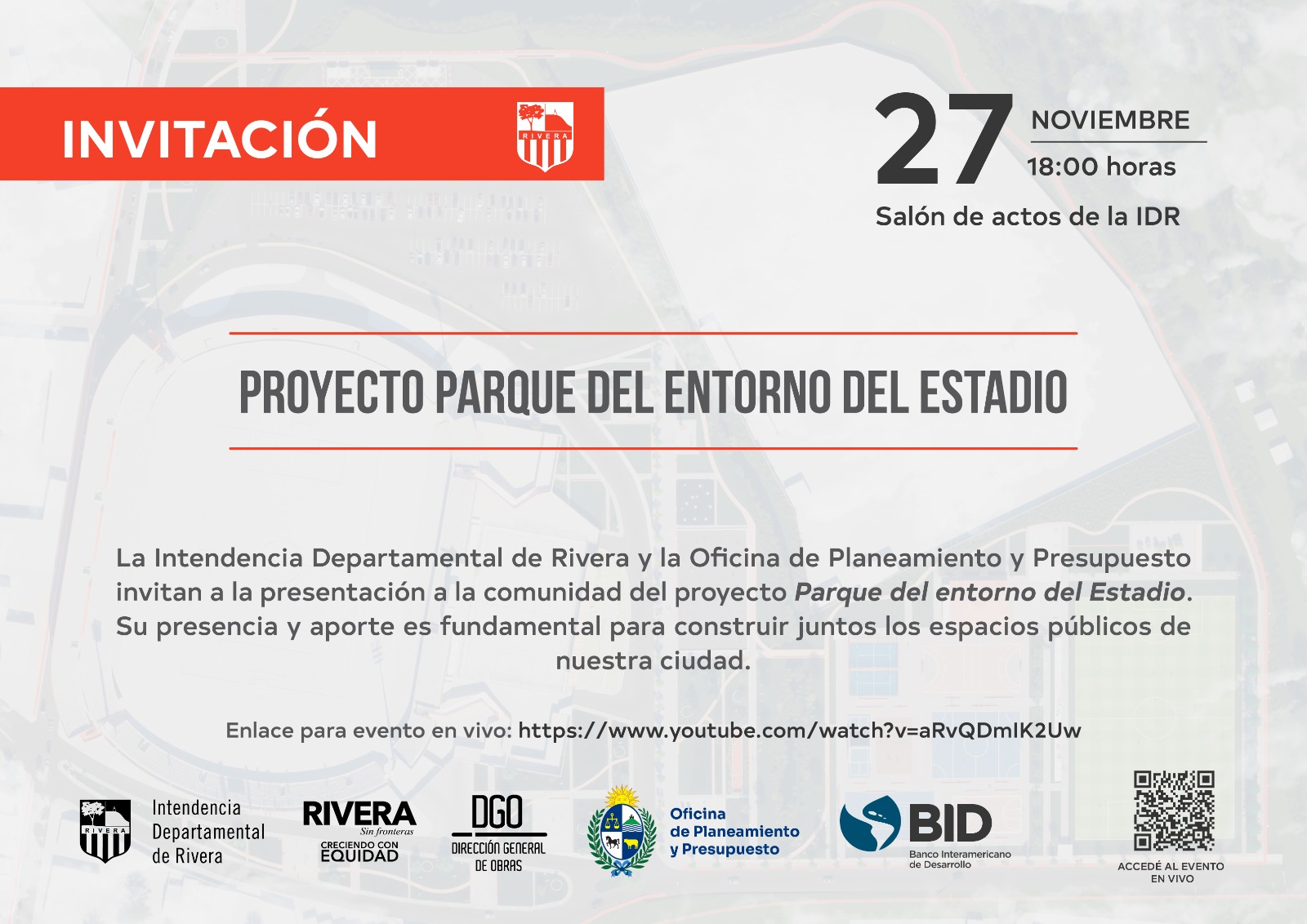 La Intendencia Departamental de Rivera, junto a la Oficina de Planeamiento y Presupuesto, invita a la comunidad a la presentación del proyecto Parque del entorno del Estadio. El encuentro busca compartir el diseño y los objetivos del proyecto, escuchar aportes de vecinas y vecinos, y avanzar en la construcción participativa de los nuevos espacios públicos de la ciudad.