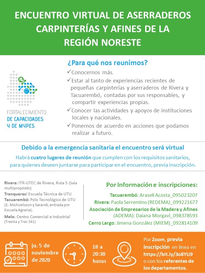 Este jueves 5 de noviembre, desde la hora 18:30 a 20:30 hs, se realiza el “Encuentro Virtual de Aserraderos Carpinterías y afines de la Región Norte”, abarcando a los departamentos de Tacuarembó, Cerro Largo y Rivera, lo realizan en dos modalidades, virtual y presencial.