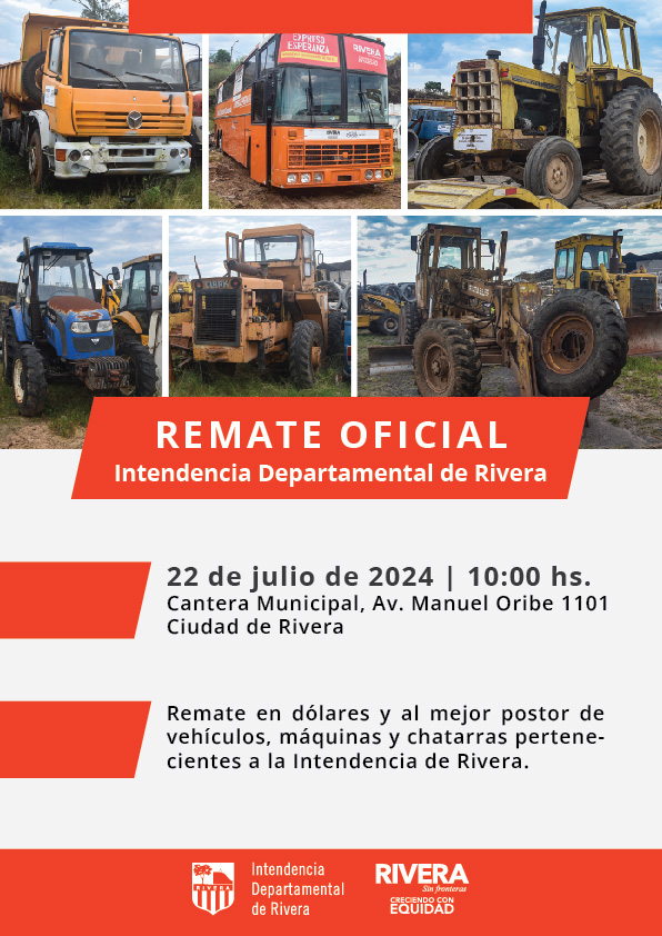 La Intendencia Departamental de Rivera realizará un remate oficial el próximo 22 de julio, a las 10 horas, en el predio de la Cantera Municipal (Av. Manuel Oribe 1101).