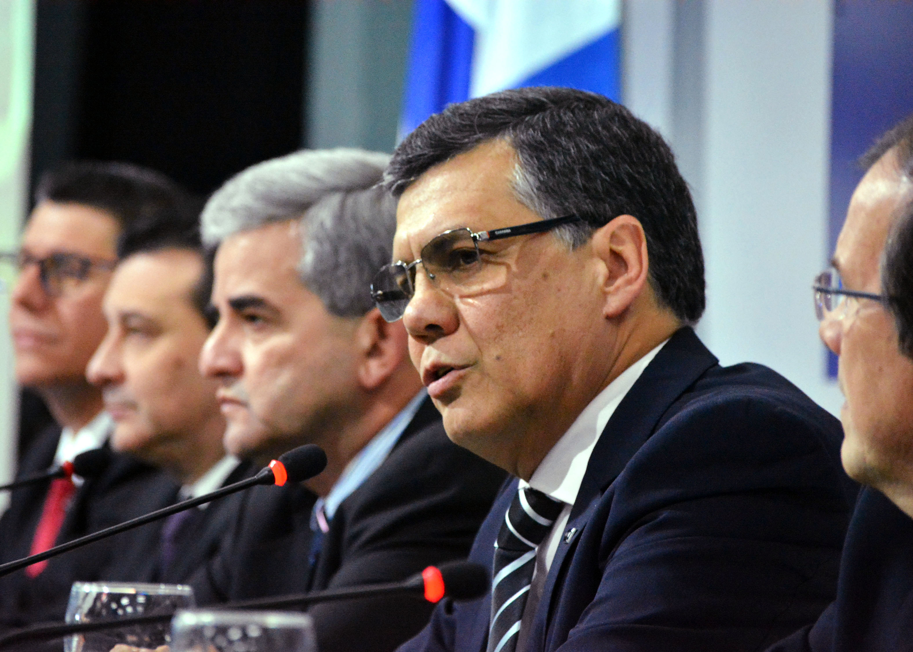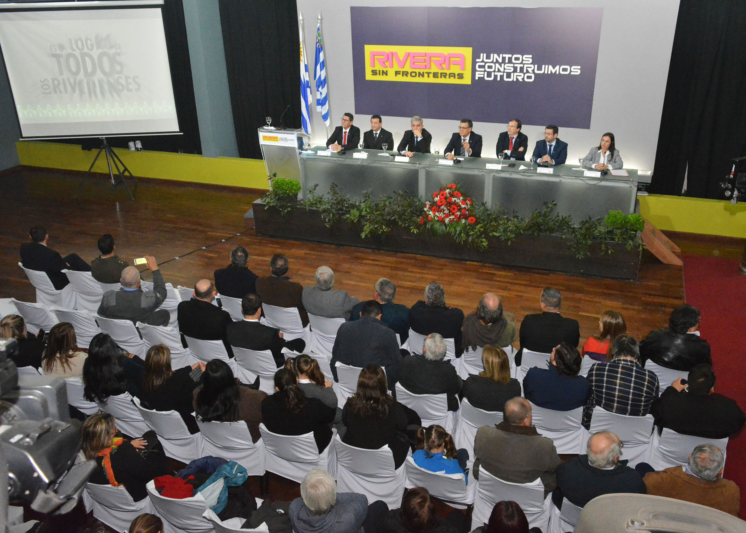 En la mesa principal estuvieron presentes: el Intendente, Dr. Marne Osorio, a su izquierda, el Secretario General de la IDR, Cr. Richard Sander, Dir. Gral. Promoción y Acción Social, Cr. Giovani Conti y Dir. Gral. de Hacienda, Cra. Daniela Porto. A su derecha, Dir. Gral. de Obras, Arq. José Mazzoni, Dir. Gral. de Desarrollo y Medio Ambiente, QF. Alejandro Bertón y Dir. Gral. Tránsito y Transporte, Sr. Mauricio González.