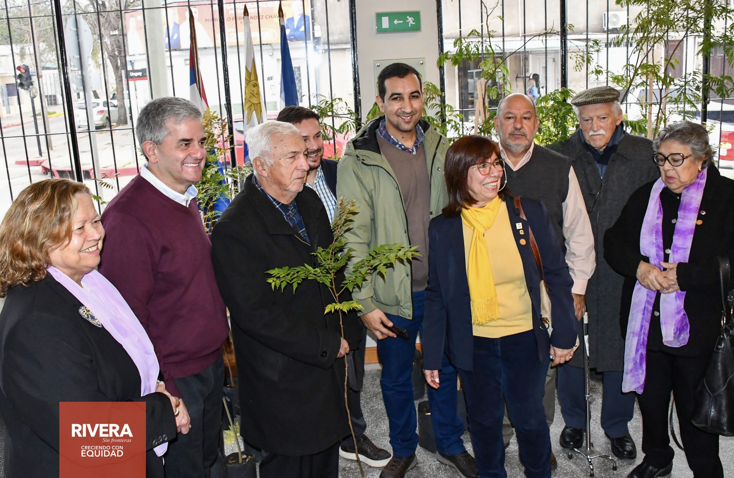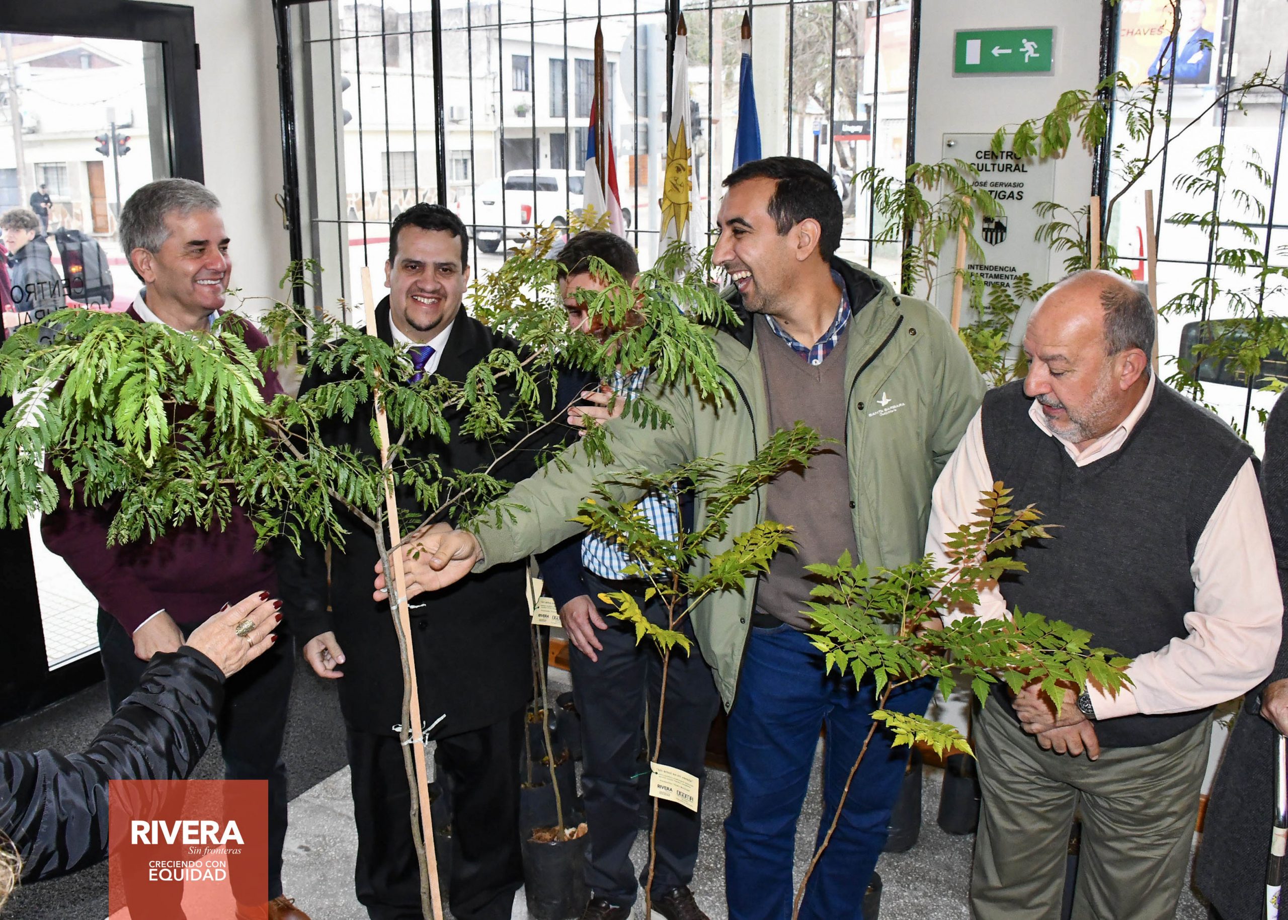 Para finalizar la conferencia, el intendente, en nombre del pueblo de Rivera, hizo entrega de varios plantines de árboles autóctonos al Club de Leones Rivera Livramento, que los trasplantará a su lugar definitivo en la calle Oscar Riera.