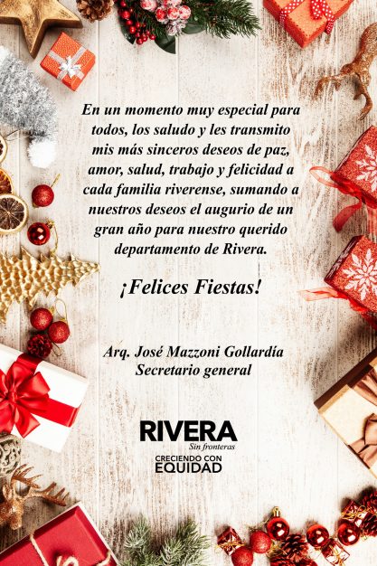 En un momento muy especial para todos, los saludo y les transmito mis más sinceros deseos de paz, amor, salud, trabajo y felicidad a cada familia riverense, sumando a nuestros deseos el augurio de un gran año para nuestro querido departamento de Rivera.