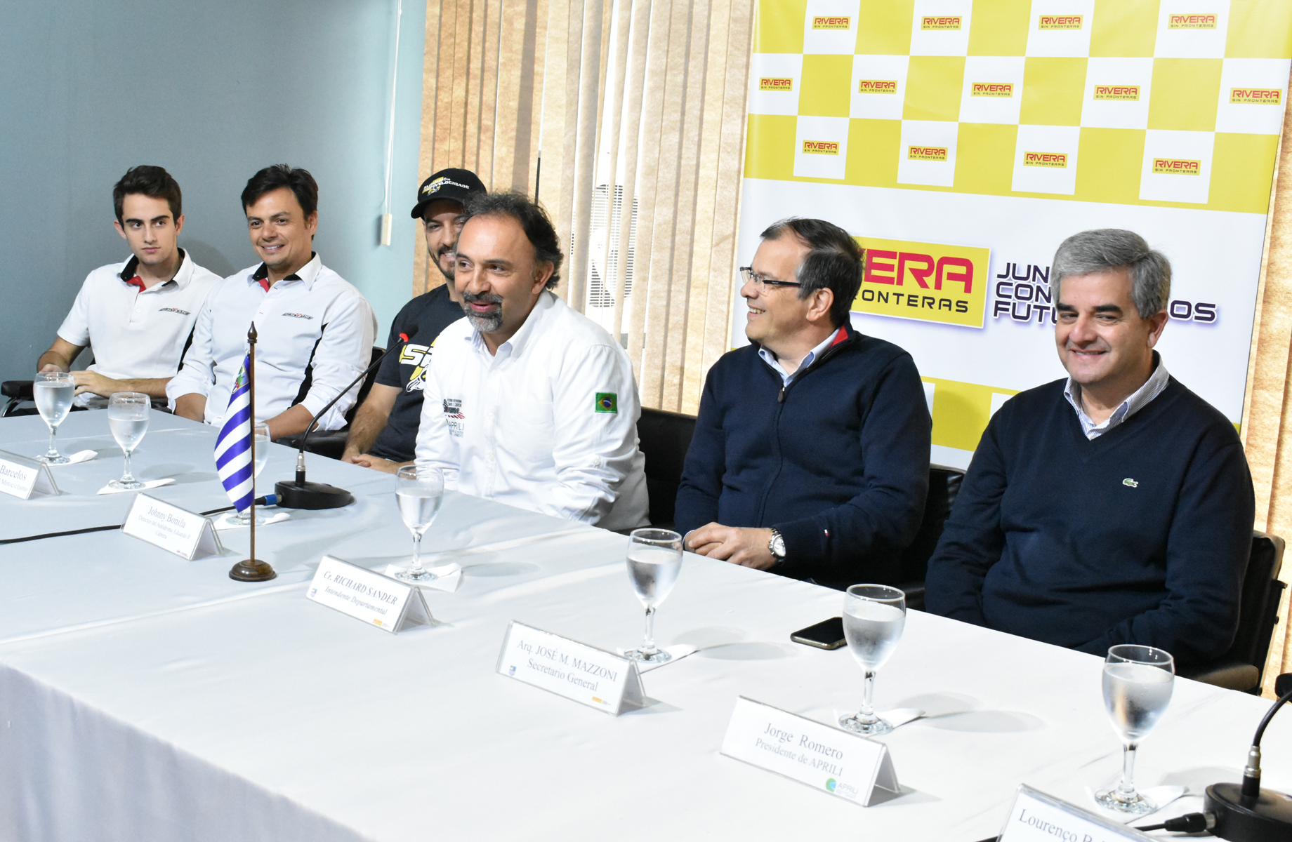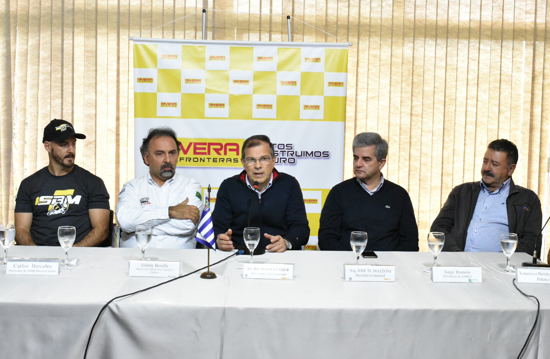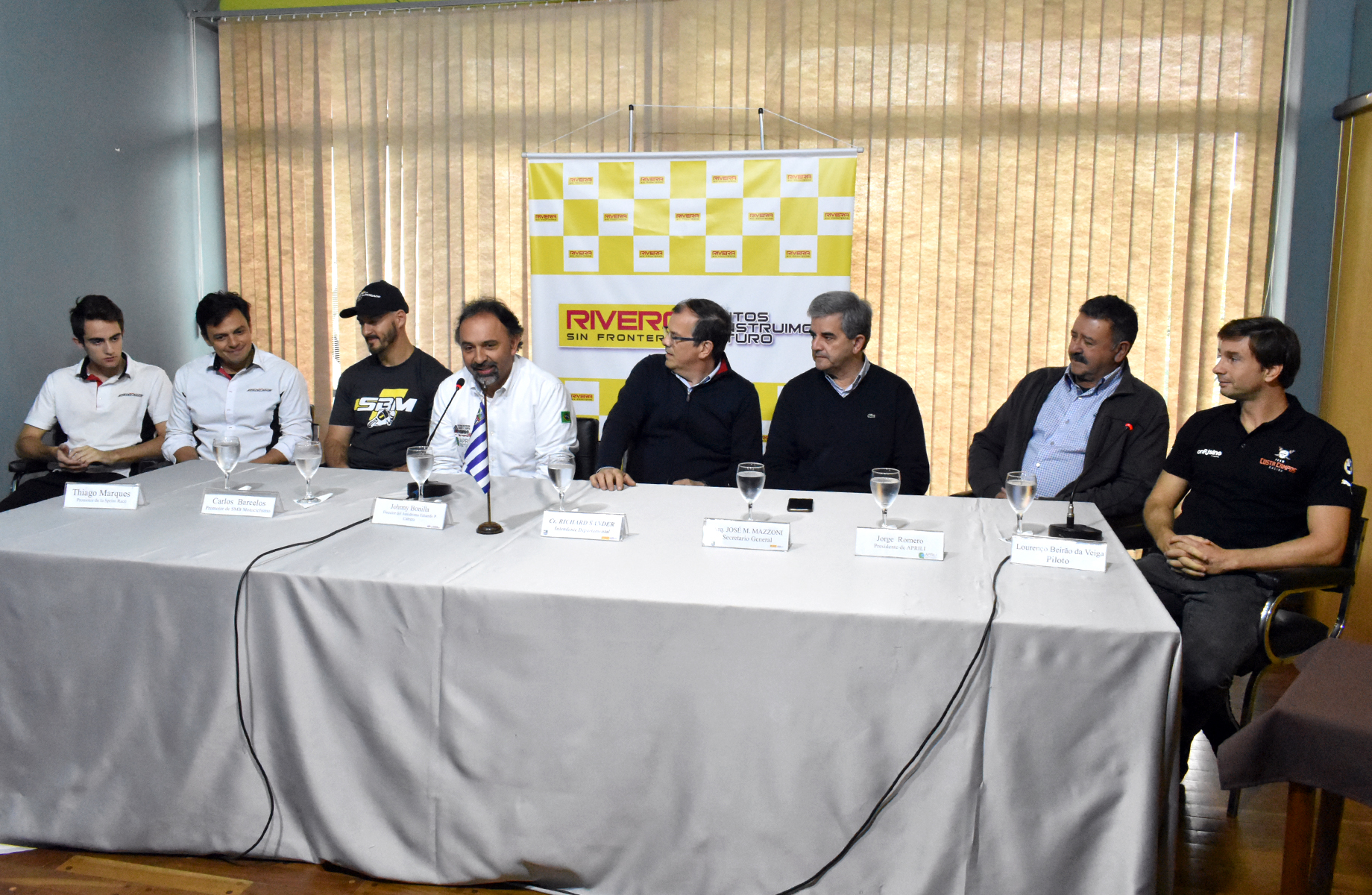 Conformaron la mesa junto al Intendente Departamental de Rivera, el secretario General de la IDR, Arq. José Mazzoni, el director del Autódromo Eduardo P. Cabrera, el presidente de la Asociación de Pilotos Rivera Livramento (APRILI), los Productores del campeonato Sul Brasileiro de Motociclismo y la SPRINT RACE; los pilotos Pedro López y Lourenço Beirao da Veiga.