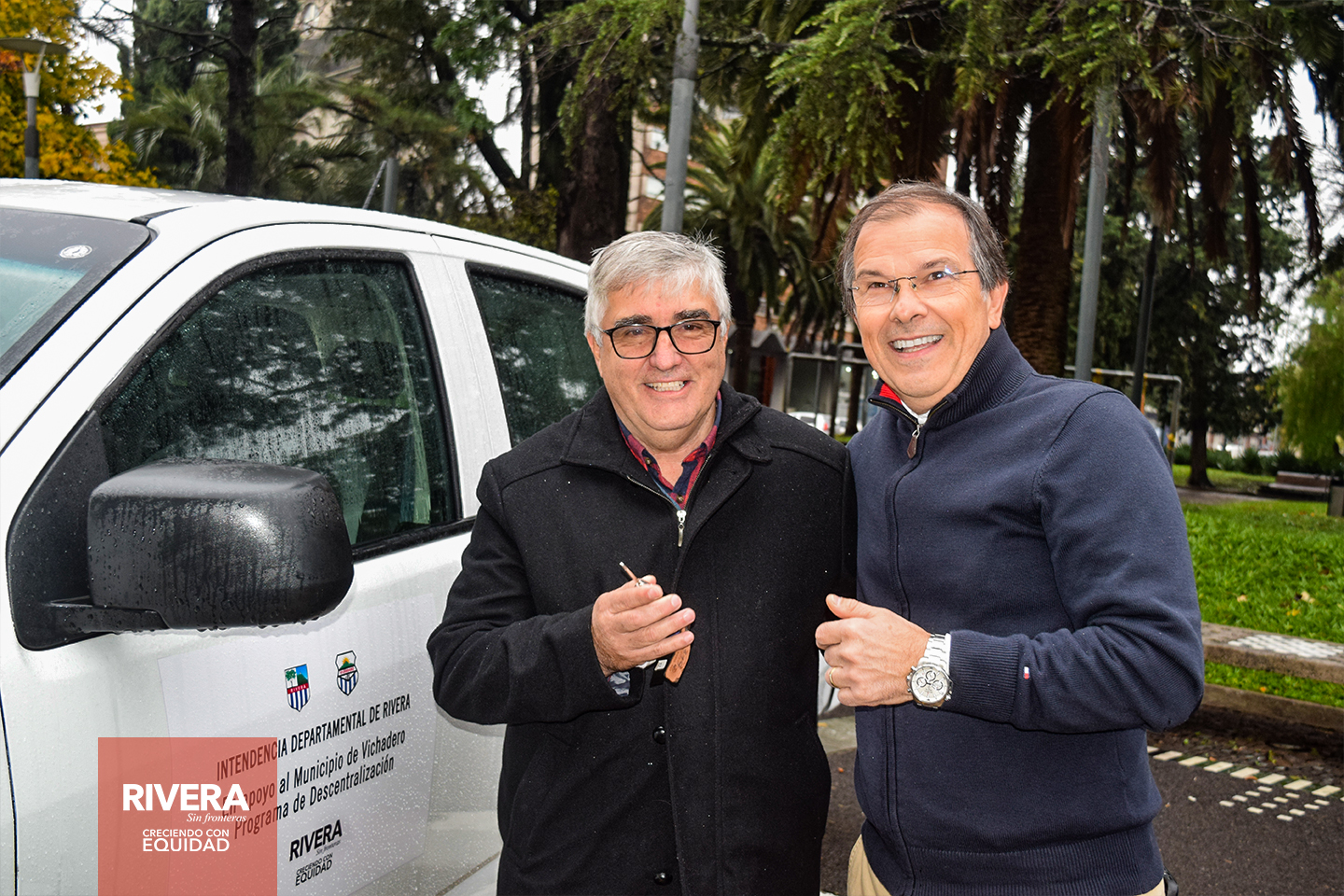 El intendente de Rivera Cr. Richard Sander Darín, junto al secretario general de la IDR, hicieron entrega de las llaves a los alcaldes de Minas de Corrales, Tranqueras y Vichadero.