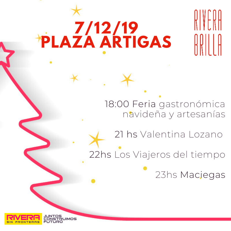 Este 7 de diciembre, a las 18 horas, comenzará la Feria Gastronómica Navideña y Artesanías. El evento, parte de Rivera Brilla 2019, tendrá lugar en Plaza Artigas. La jornada, contará también con el show de Valentina Lozano, Los Viajeros del Tiempo y Maciegas.