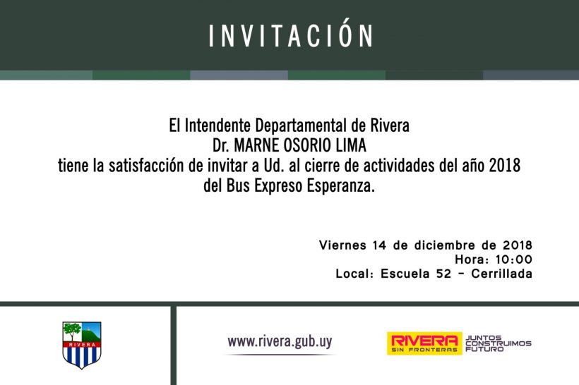 El día viernes 14 de diciembre, a las 10:00 horas, se llevará a cabo en la Escuela 52 de Cerrillada el cierre de actividades del año 2018 del Bus Expreso Esperanza. Estará presente el Intendente Departamental de Rivera Dr. Marne Osorio Lima y demás autoridades.