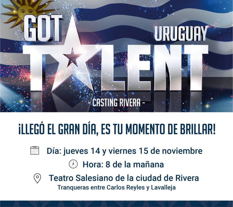 El jueves 14 y viernes 15 de noviembre, se realizará el casting de GOT TALENT en Rivera! El evento se realizará en el Teatro Salesiano (Tranqueras, entre Carlos Reyles y Lavalleja), a partir de las 8 horas. Inscripciones en www.canal10.com.uy
